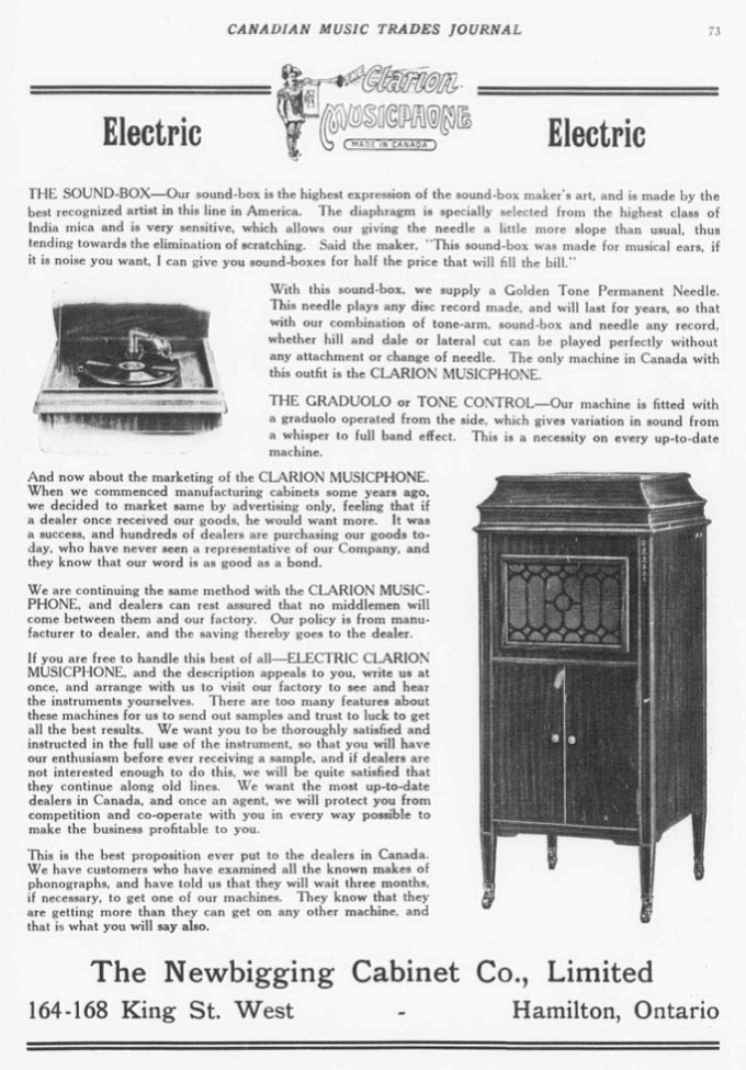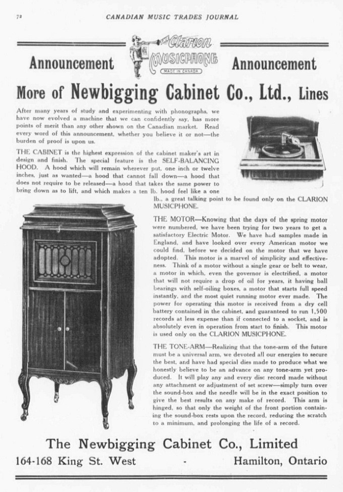 Newbigging experimented with manufacturing a phonograph back in 1909. Initially it was named the "Clarion Musicphone". From Canadian Music Trades Journal, August, 1916, p. 91: