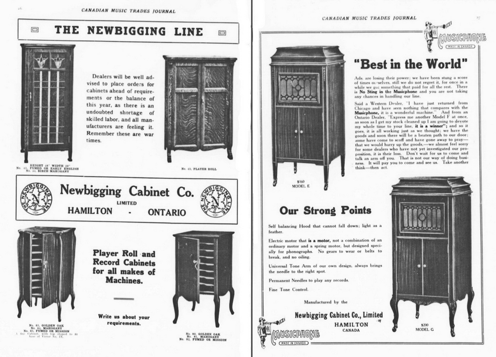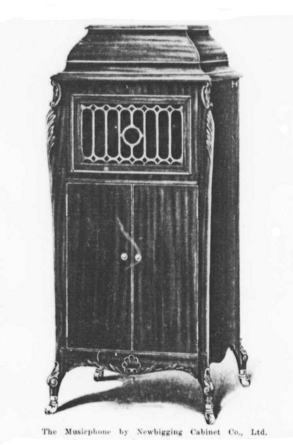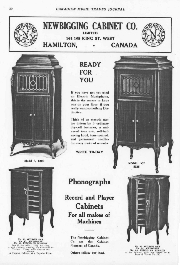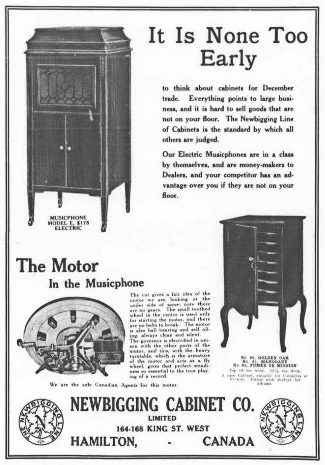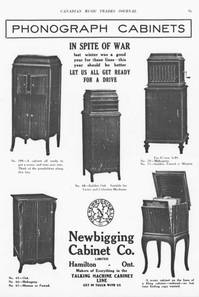 For many years prior to August, 1916, the Newbigging Cabinet Company supplied cabinets for phonographs, records and cylinders. They advertised extensively in the