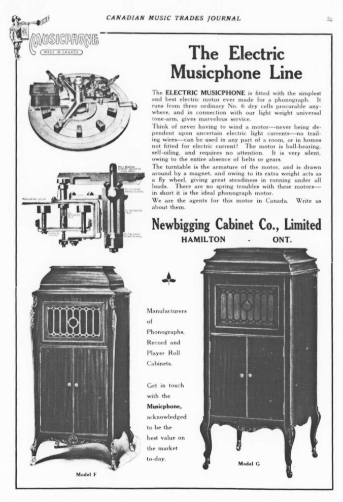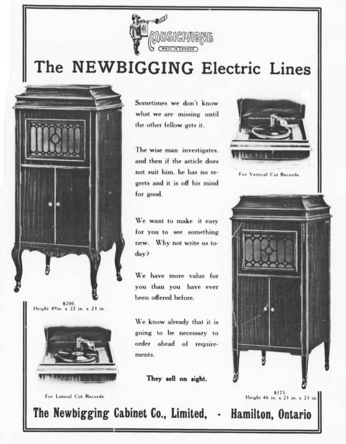 Edward Moogk's Roll Back The Years on p. 62 states: "Operations started up in other Ontario centres. In Hamilton, the Newbigging Cabinet Company, specialists in player-piano rolls and record cabinets, came out with its Musicphone, a Canadian-built machine with an electrical motor, capable of playing both vertical and lateral cut records."