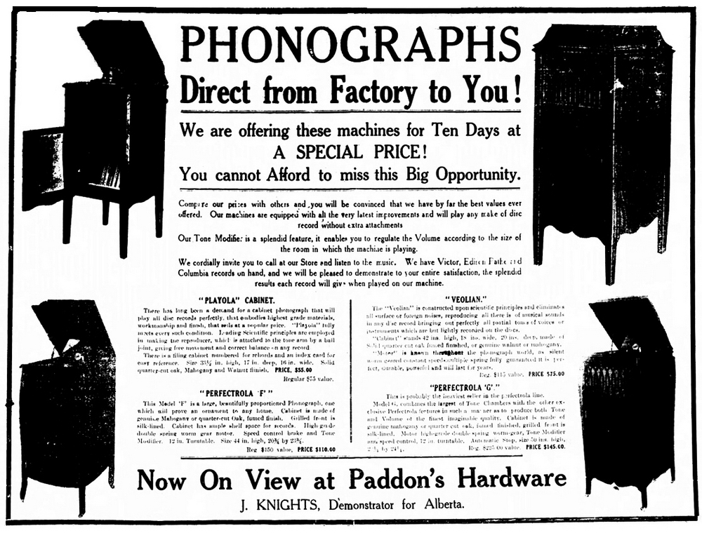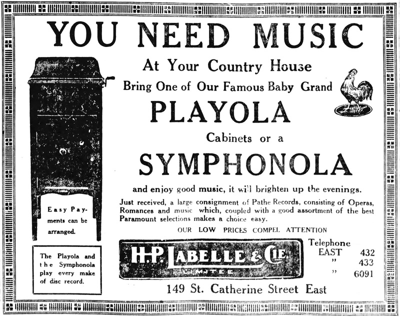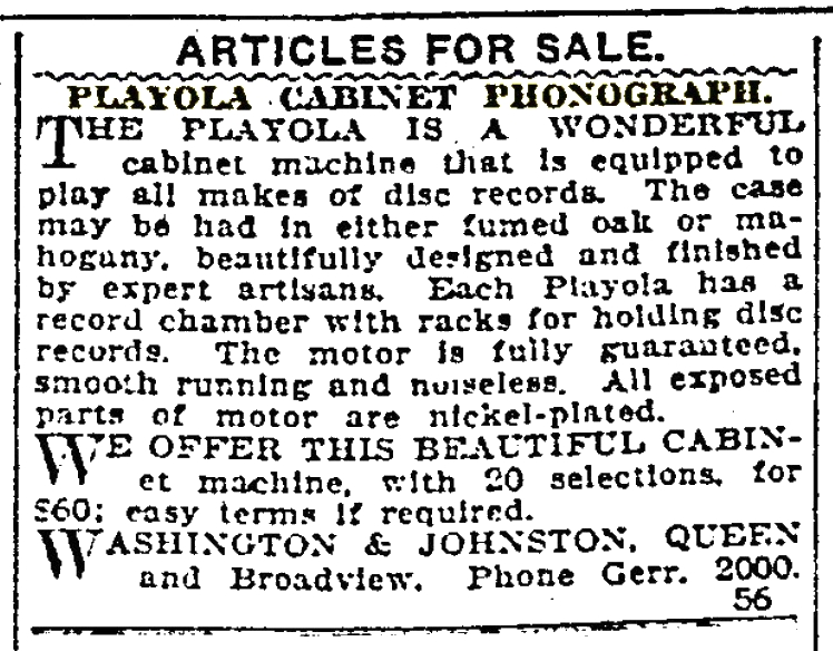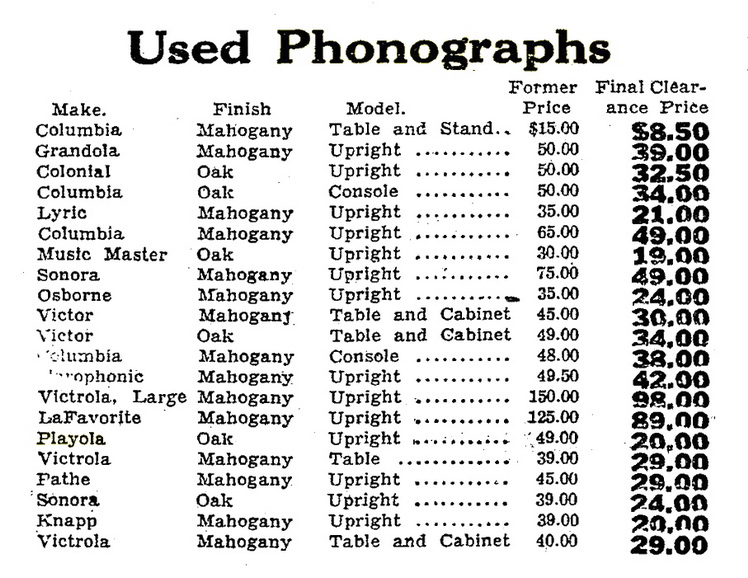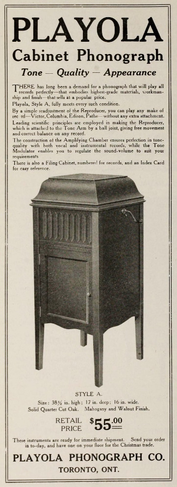 Toronto Daily Star, September 14, 1928, p. 4. An R.S. Williams Co., Ltd. ad for used phonographs including a Playola.... and also an Osborne and a La Favorite.