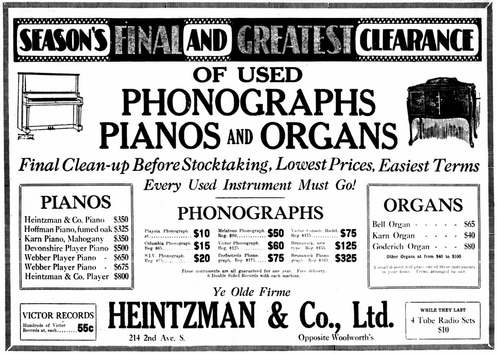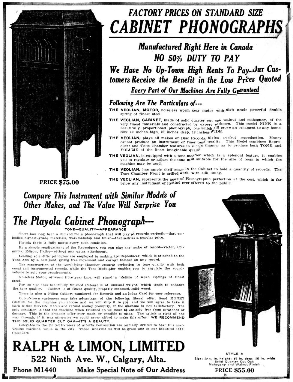 Star-Phoenix (Saskatoon), February 25, 1928, p. 15. Heintzman & Co. Ltd. ad for used phonographs including a Playola.... and also an S.I.V., a Melatone and a Perfectrola.