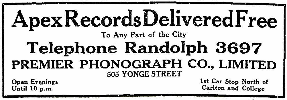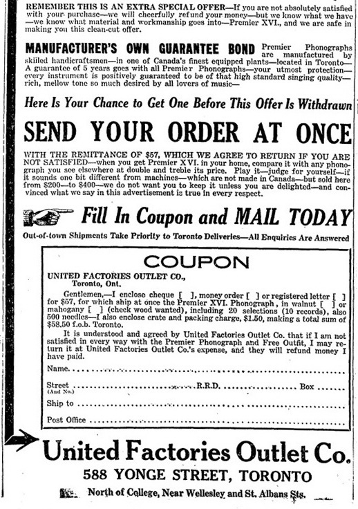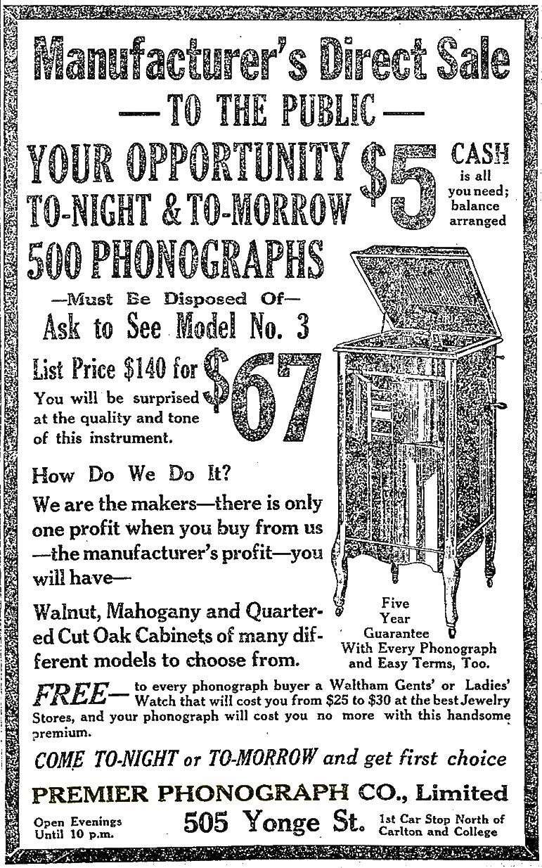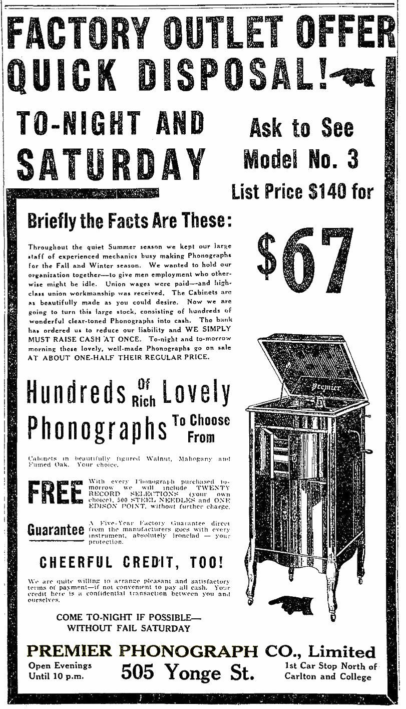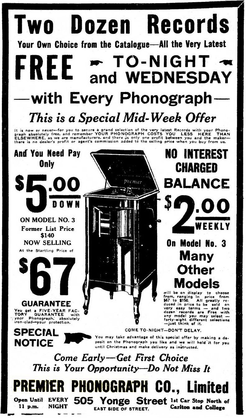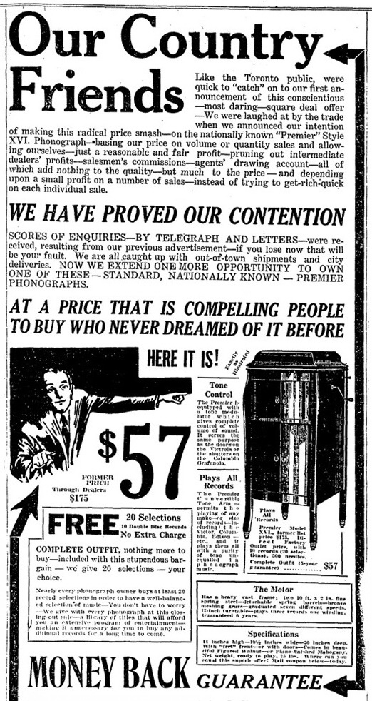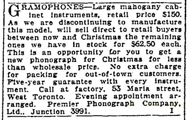 The Globe, April 13, 1923, p. 5. Top and bottom. Premier Model XVI: "Premier Phonographs are manufactured by skilled handicraftsmen -- in one of Canada's finest equipped plants -- located in Toronto"