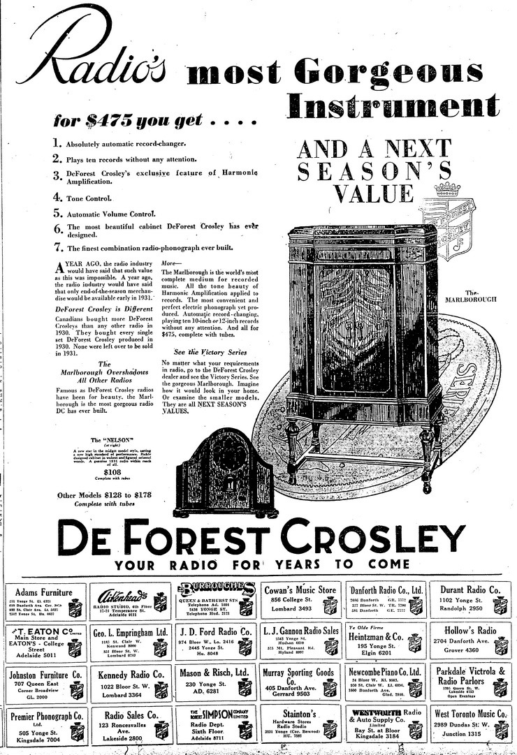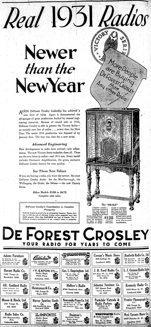 Two ads from the Toronto Daily Star dated January and February 1931 advertising DeForest Crosley radios and showing Premier Phonograph Co. as one of the dealers:
