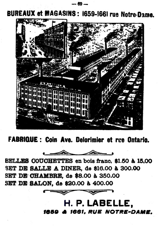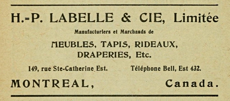 The story of H.P. Labelle & Cie., Limitée Le commerce de Montreal et de Québec et leurs industries en 1889, p. 142: "There are many furniture dealers in Montreal; but it seems to us that there are few who deserve more special mention than Messrs. H. P. Labelle and Co., manufacturers and dealers in furniture of all descriptions, whose establishment is located at No. 1661 Notre-Dame Street, Montreal. This establishment was founded in 1871 and through the energy and enterprise of its members has grown to considerable proportions. Now its trade extends throughout the city and surrounding squares. The building occupied is 100 x 20 feet in size. They carry a complete assortment of furniture of all descriptions, which is sold at very moderate prices." (Translated from the original French) L'Almanach du peuple illustré de C. O. Beauchemin & fils, 1894: Illustration of Labelle factory. The origin and services of the 3rd (Montreal) field battery of artillery, 1898: Ad for Labelle & Cie, Limitée.