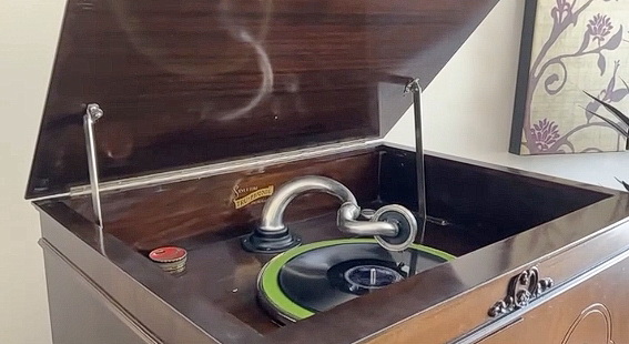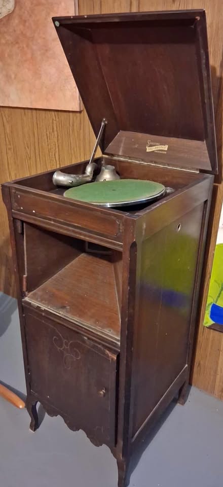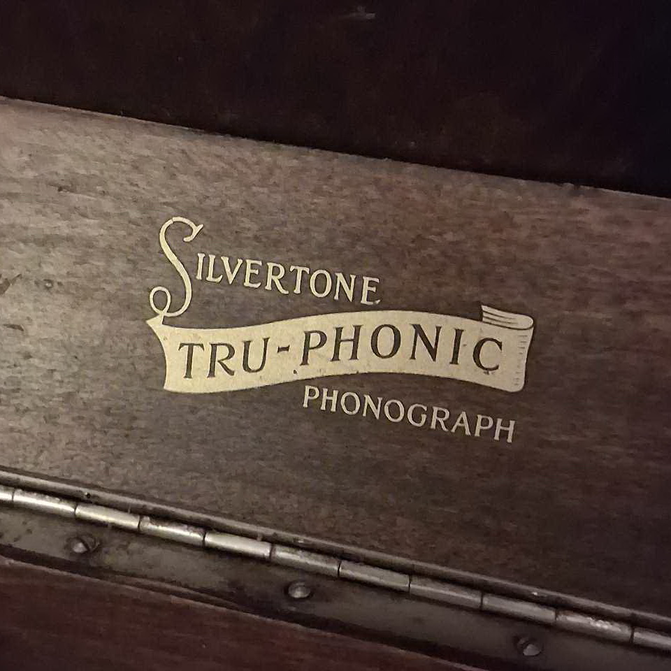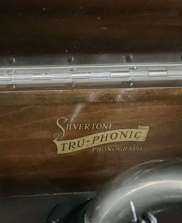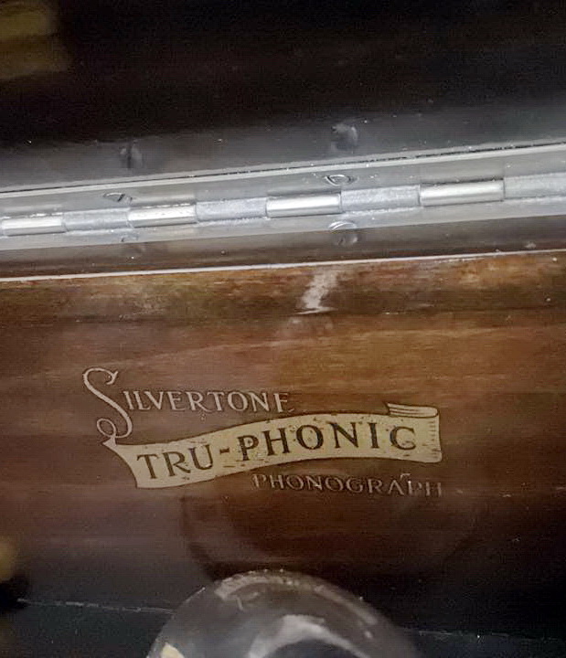 A Silvertone Tru-phonic phonograph for sale on FB Marketplace in Tillsonburg Ontario in 2025. It is not known whether this is a Canadian-made machine manufactured by the Lepage Communion Cup Company. The "S", however, in the label is very similar to the "S" in the Lepage Silvertone and very dissimilar to the American Silvertone brand.