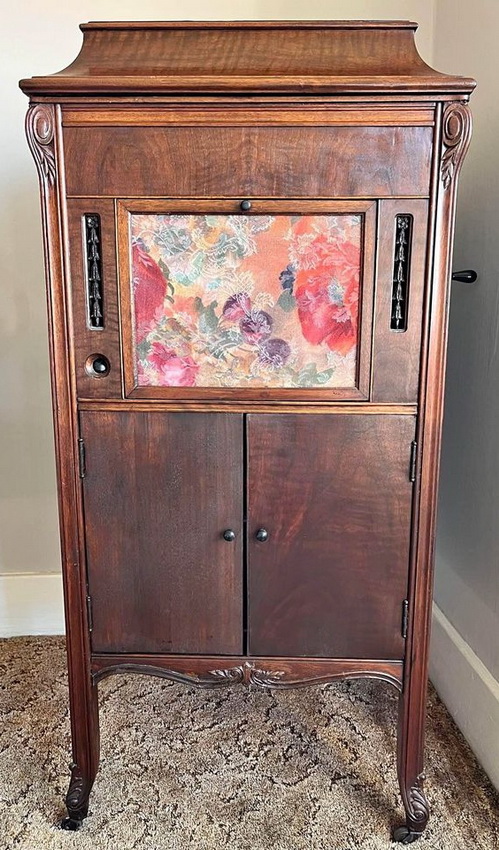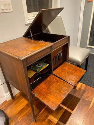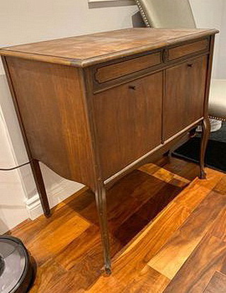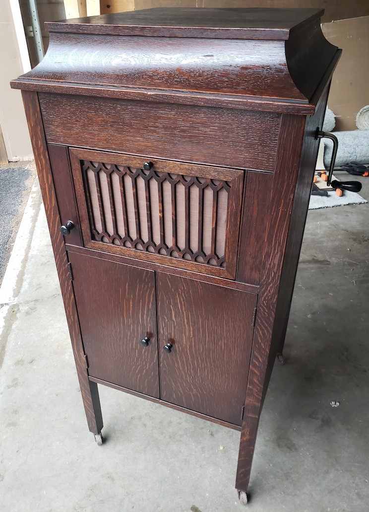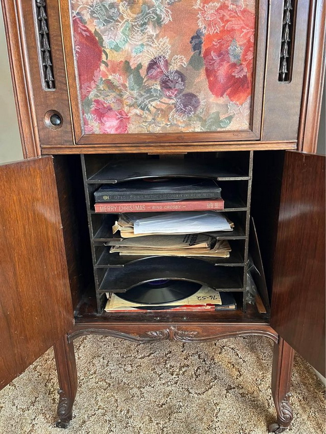 Photographs of a console model Scythes-Vocalion Company Aeolian-Vocalion phonograph for sale in Hamilton, Ontario in 2024.