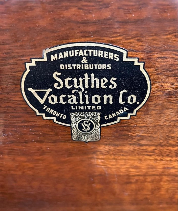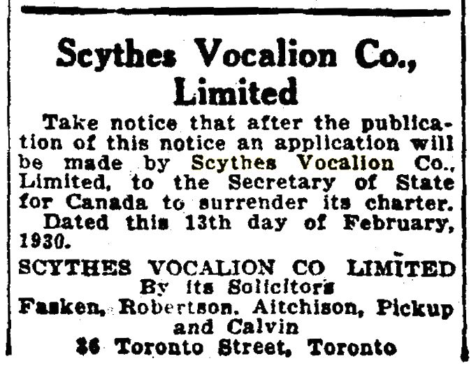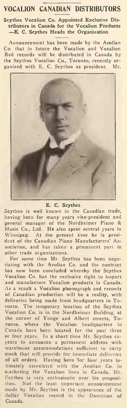 Talking Machine World, April, 1921, p. 121: "VOCALION CANADIAN DISTRIBUTORS - Scythes Vocalion Co. Appointed Exclusive Distributors in Canada for the Vocalion Products -E. C. Scythes Heads the Organization. Announcement has been made by the Aeolian Co. that in future the Vocalion and Vocalion Red records will be distributed in Canada by the Scythes Vocalion Co., Toronto, recently organized with E. C. Scythes as president. Mr. Scythes is well known in the Canadian trade, having been for many years vice-president and general manager of the Nordheimer Piano & Music Co., Ltd. He also spent several years in Winnipeg. At the present time he is president of the Canadian Piano Manufacturers' Association, and has taken a prominent part in other trade organizations.