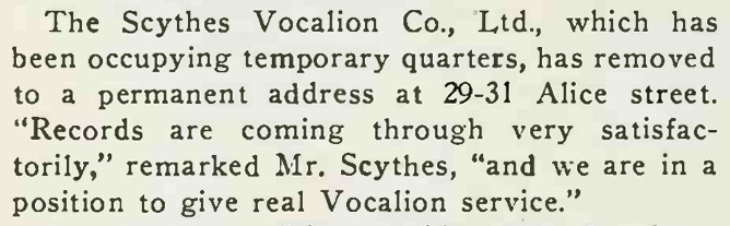 Talking Machine World, June 1921, p. 112: "The Scythes Vocalion Co., Ltd., which has been occupying temporary quarters, has removed to a permanent address at 29-31 Alice Street. 'Records are