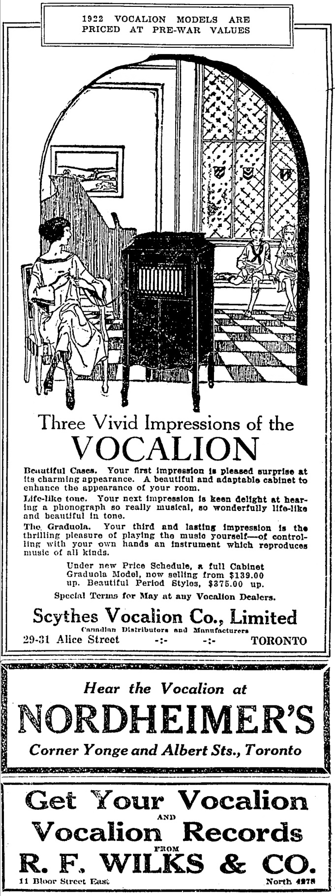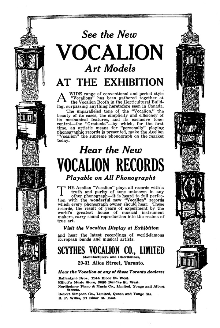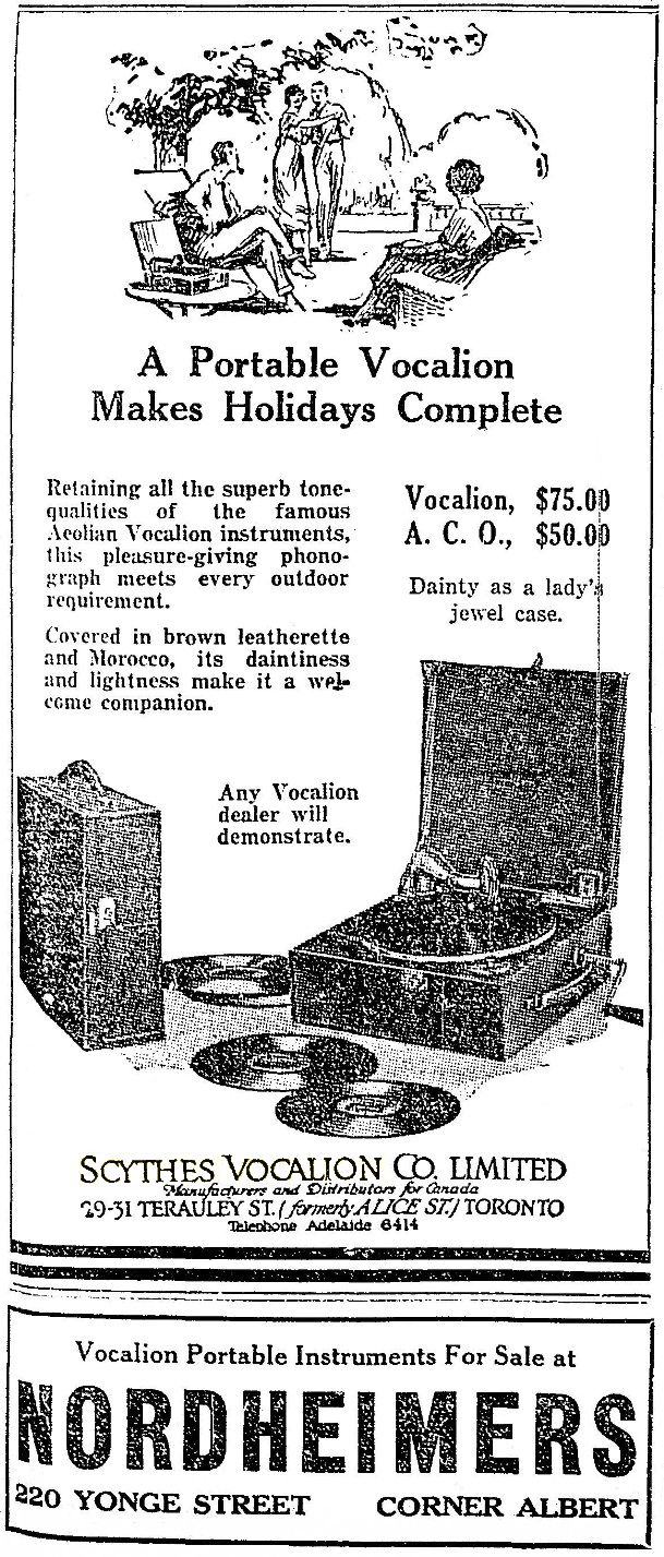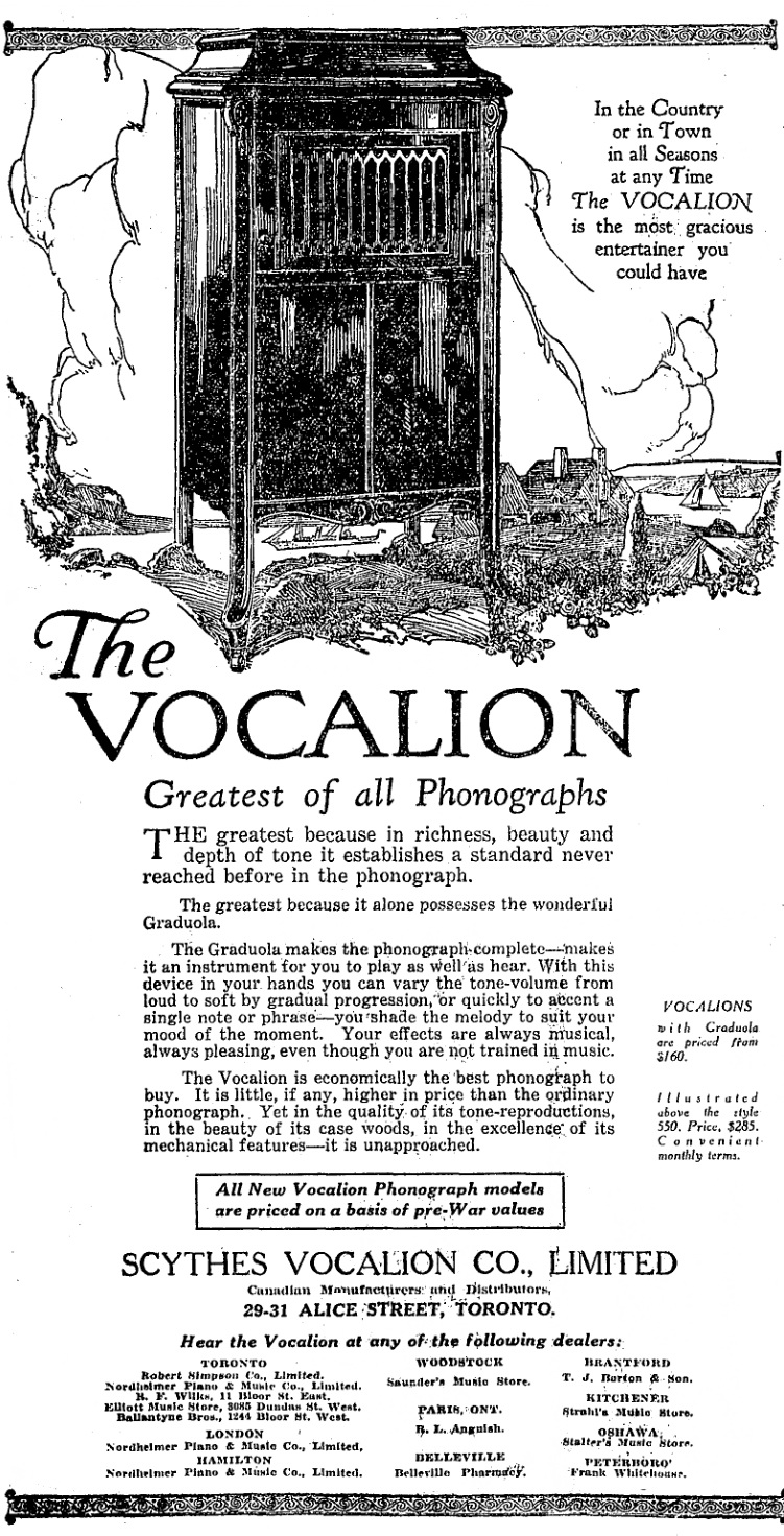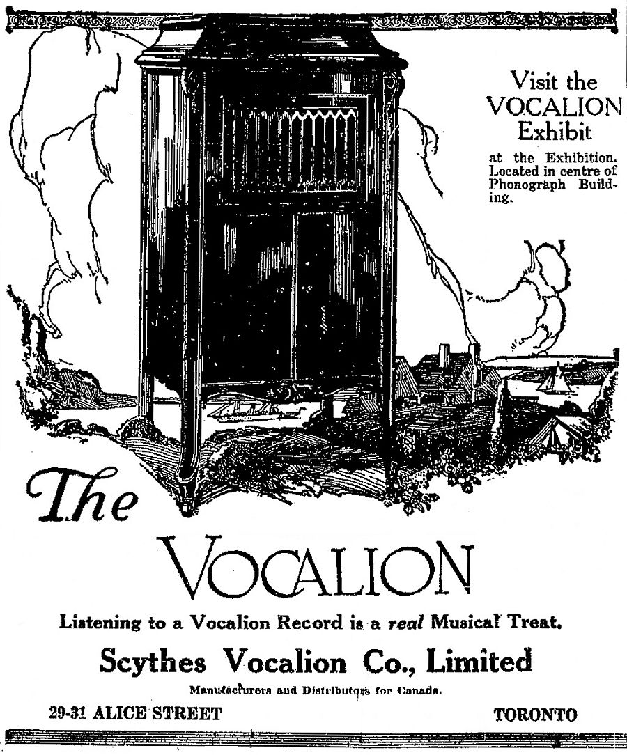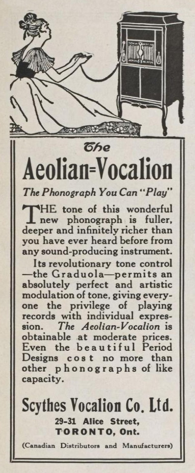 Scythes Vocalion Co. Limited, 29-31 Alice Street (renamed 29-31 Teraulay Street in 1923), Toronto, was the sole Canadian distributor of the American-made Aeolian-Vocalion brand of phonographs. Beginning in 1921, they also manufactured Vocalion phonographs and records in Canada. (see the Soloist page)