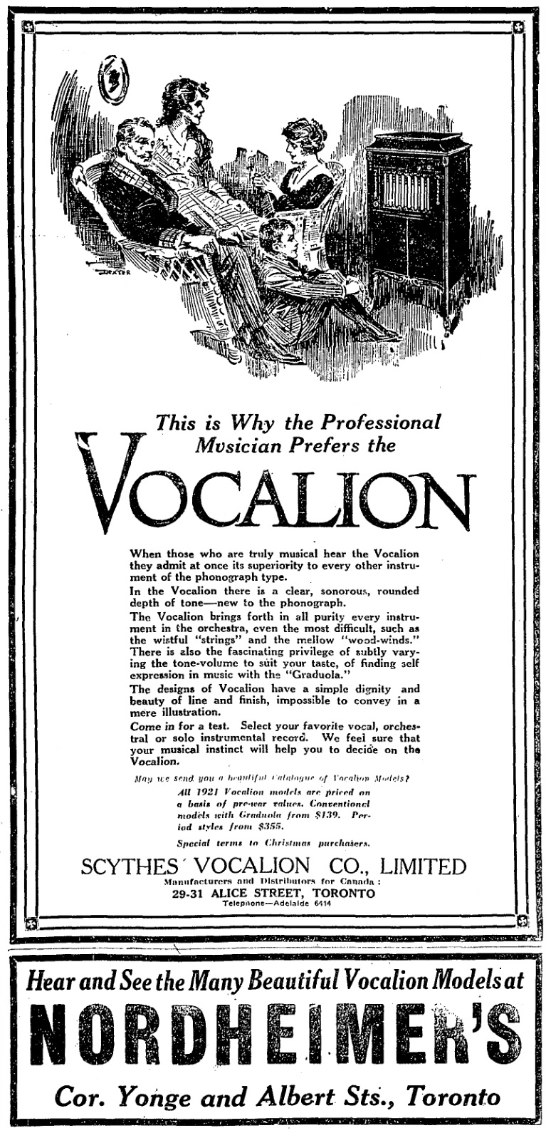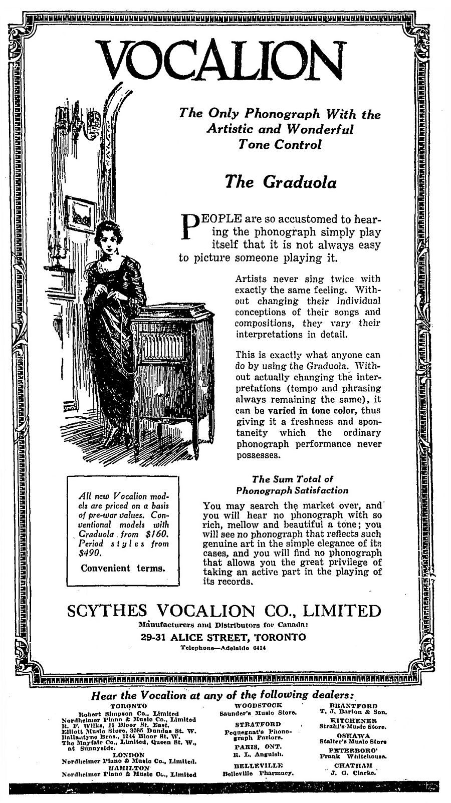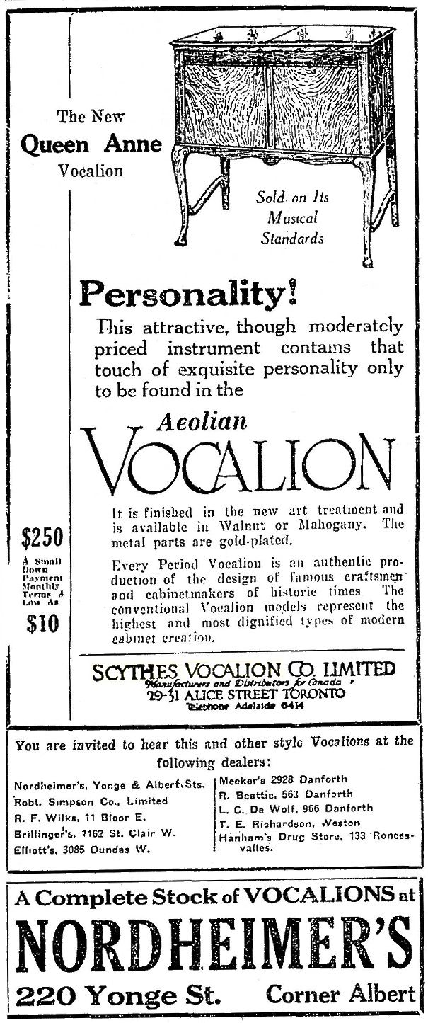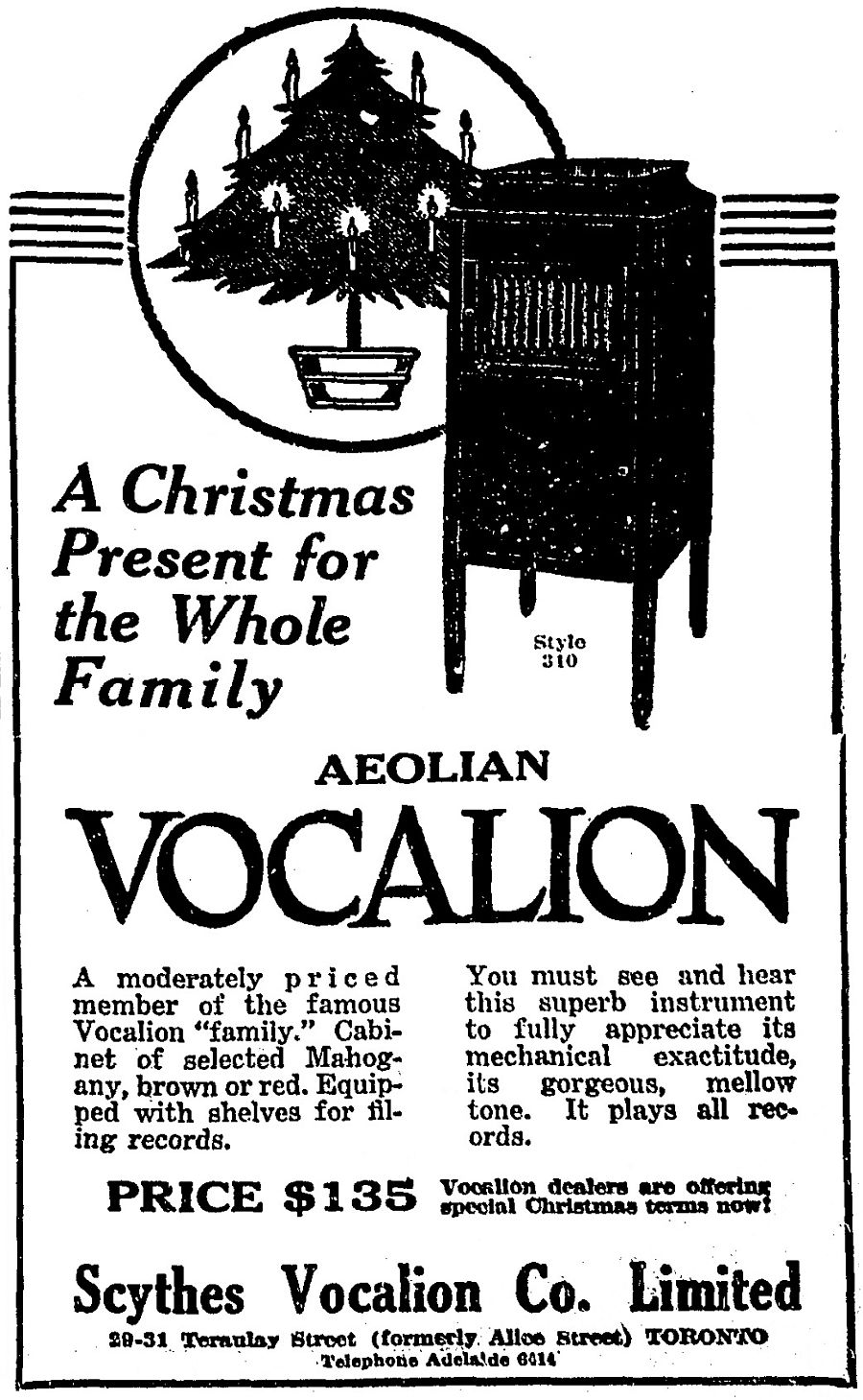 Scythes Vocalion Co. Limited, 29-31 Alice Street (renamed 29-31 Teraulay Street in 1923), Toronto, was the sole Canadian distributor of the American-made Aeolian-Vocalion brand of phonographs. Beginning in 1921, they also manufactured Vocalion phonographs and records in Canada. (see the Soloist page)