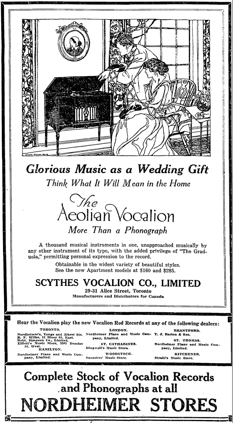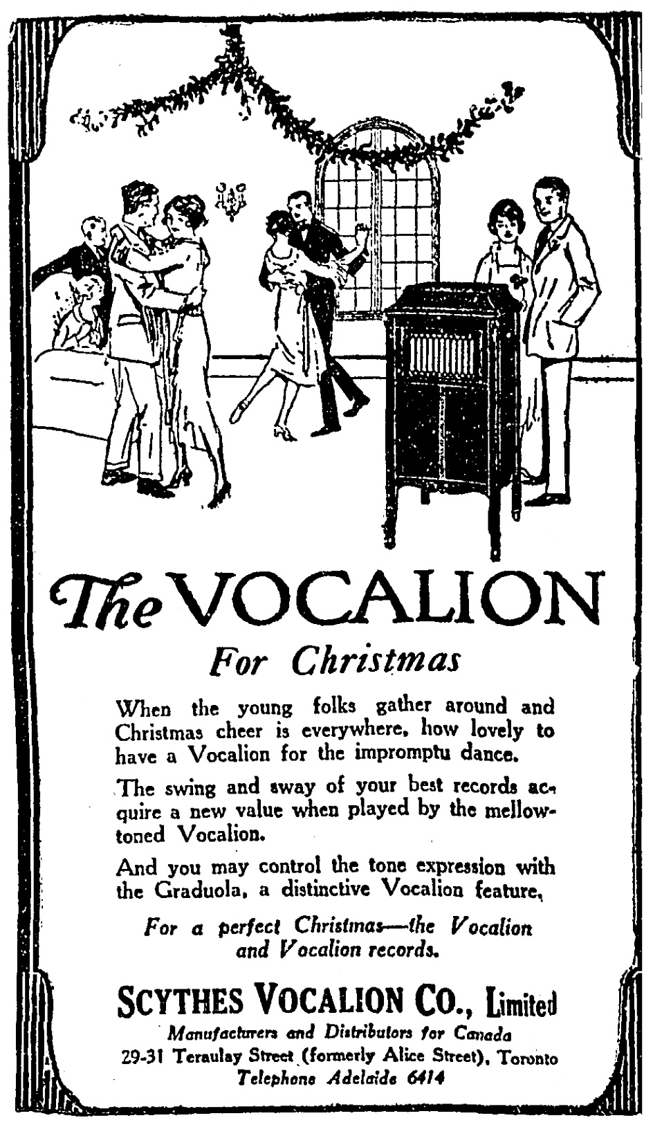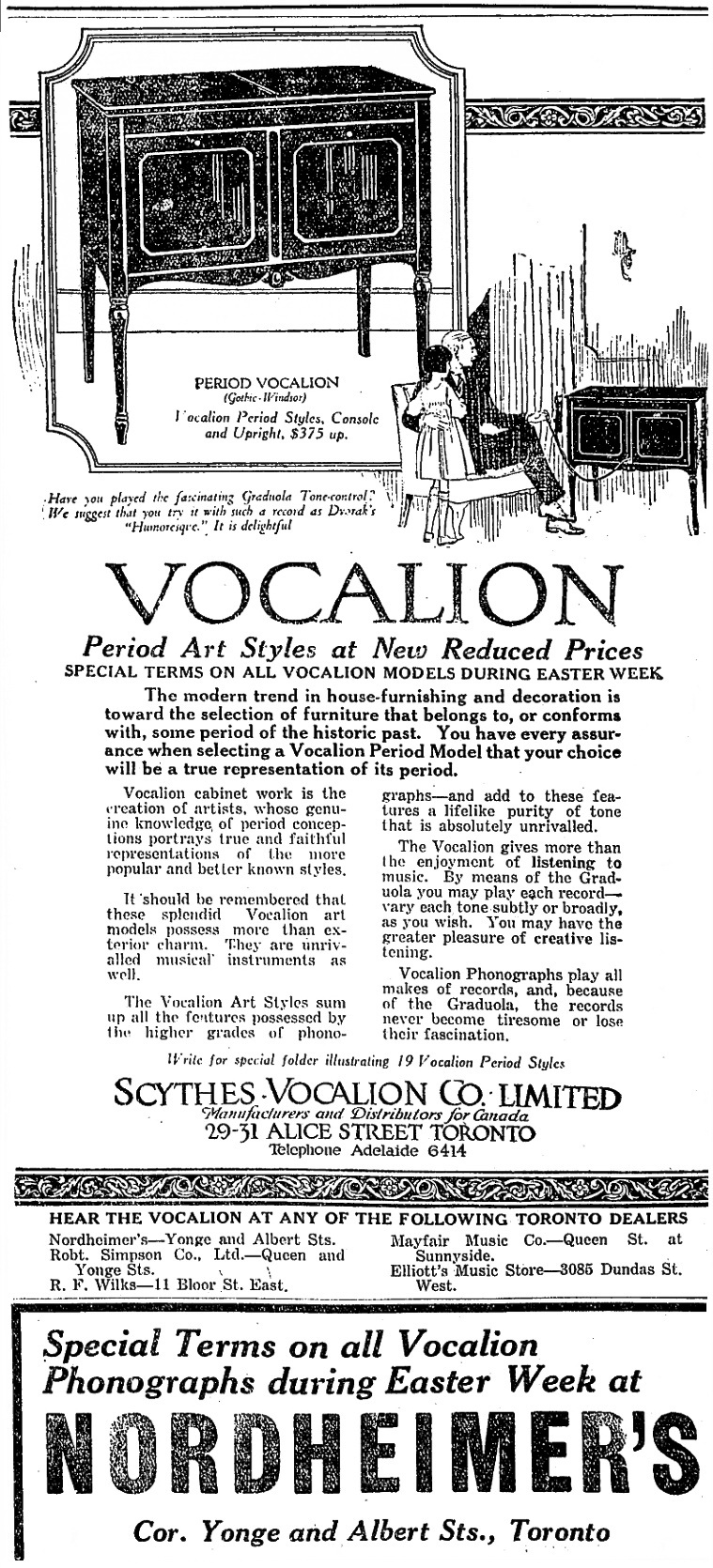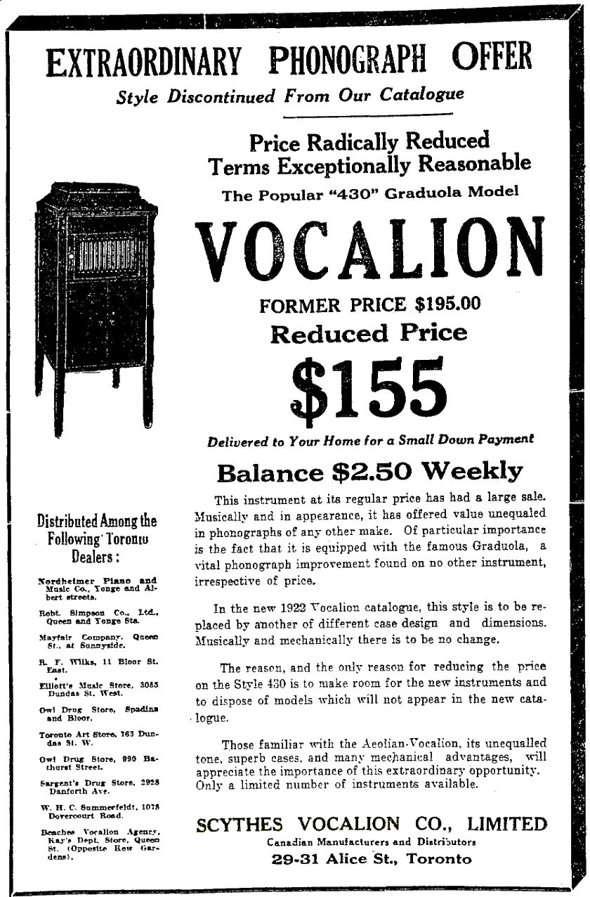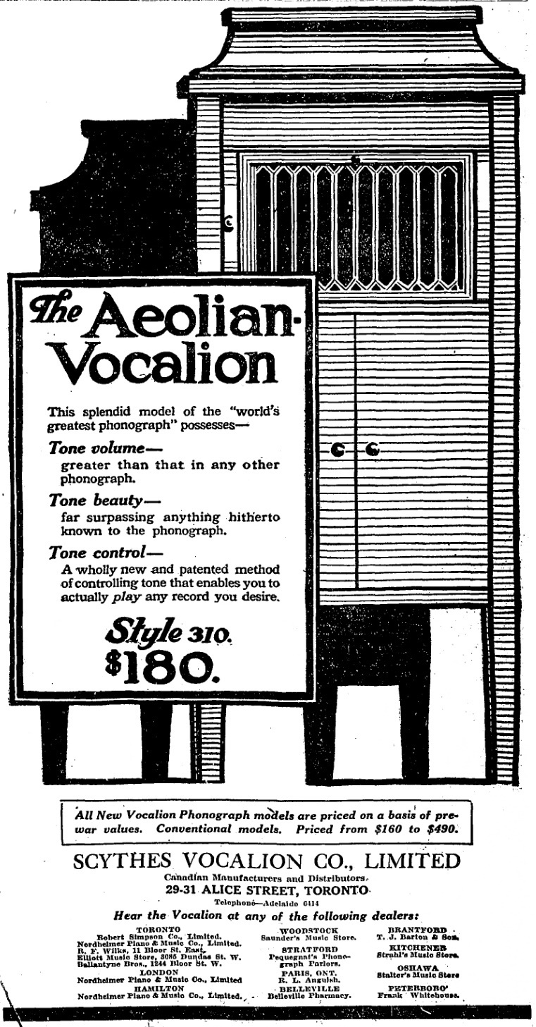 Scythes Vocalion Co. Limited, 29-31 Alice Street (renamed 29-31 Teraulay Street in 1923), Toronto, was the sole Canadian distributor of the American-made Aeolian-Vocalion brand of phonographs. Beginning in 1921, they also manufactured Vocalion phonographs and records in Canada. (see the Soloist page)