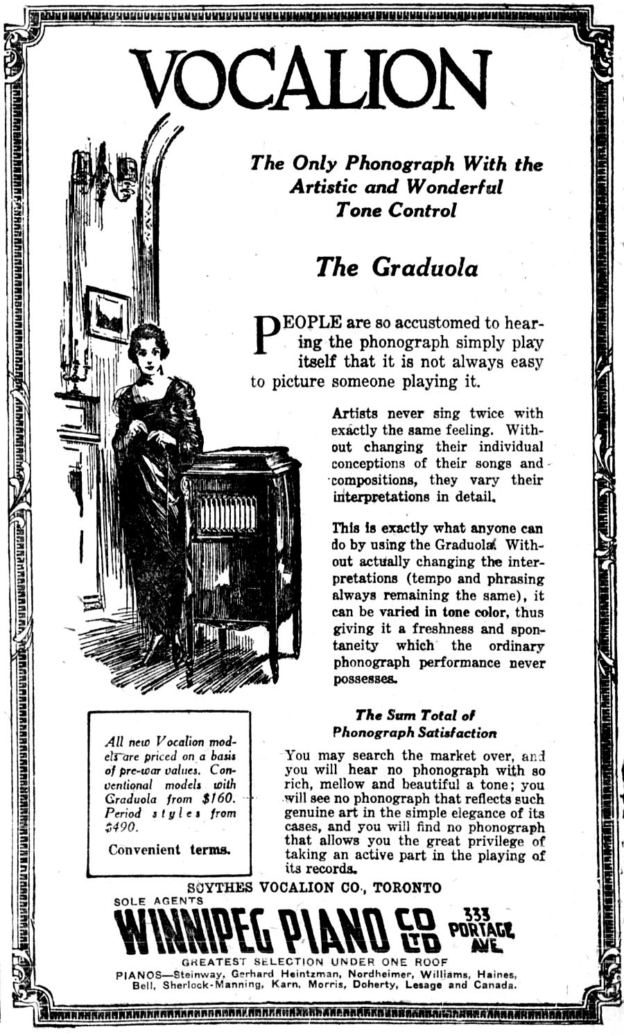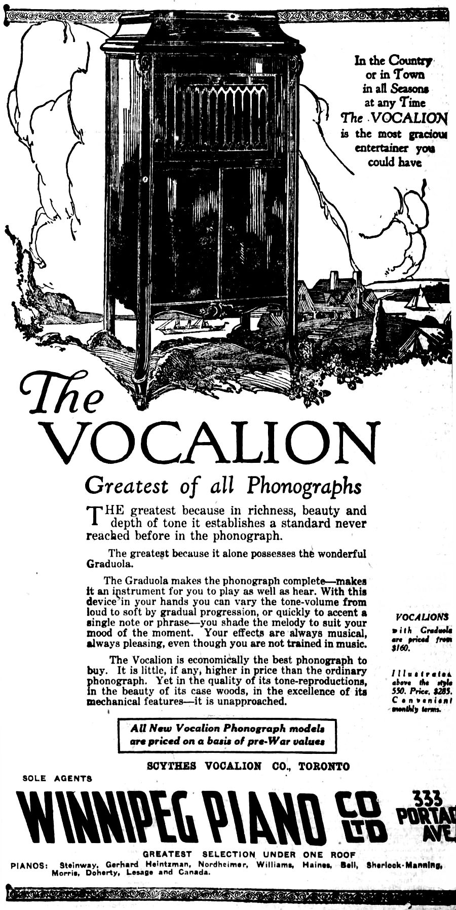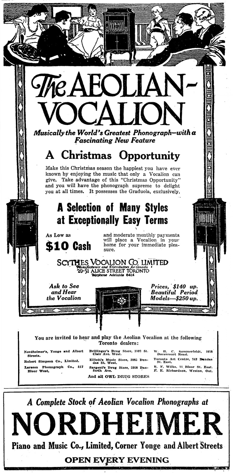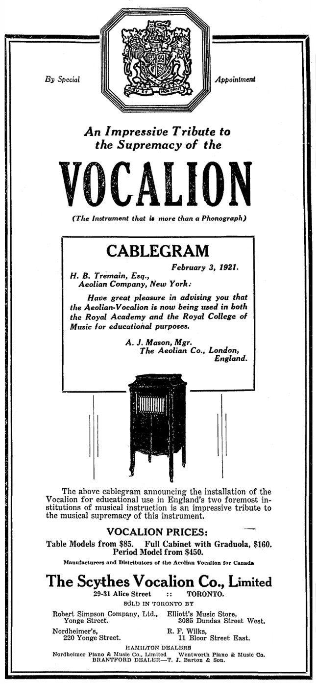 Scythes Vocalion Co. Limited, 29-31 Alice Street (renamed 29-31 Teraulay Street in 1923), Toronto, was the sole Canadian distributor of the American-made Aeolian-Vocalion brand of phonographs. Beginning in 1921, they also manufactured Vocalion phonographs and records in Canada. (see the Soloist page)