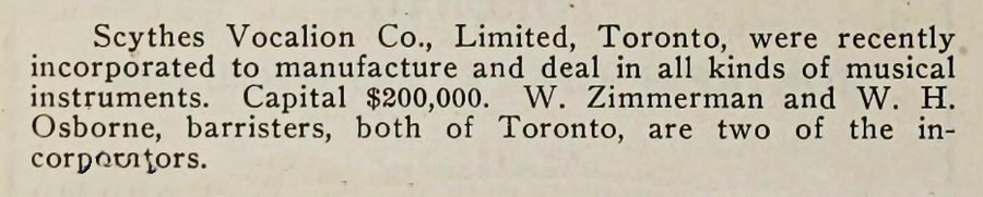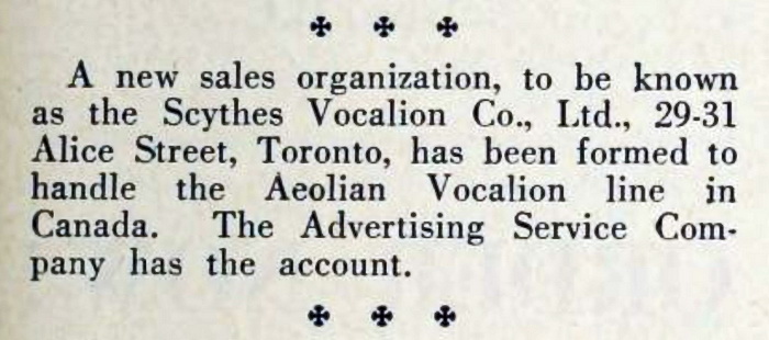 "For some time Mr. Scythes has been negotiating with the Aeolian Co. and the contract has now been concluded whereby the Scythes Vocalion Co. has the exclusive right to import and manufacture Vocalion products in Canada. As a result a Vocalion phonograph and records of Canadian production will be a reality, with deliveries being made from headquarters in Toronto. The temporary location of the Scythes Vocalion Co. is in the Nordheimer Building, at the corner of Yonge and Albert Streets, Toronto, where the Vocalion headquarters in Canada have been located for the past three or four years. In a short time Mr. Scythes expects to announce a permanent address with warehouse accommodations sufficient to carry stock that will provide for immediate deliveries of all orders. Having been for four years intimately associated with the Aeolian Co. in marketing the Vocalion lines in Canada, Mr. Scythes is very enthusiastic over his proposition. Not the least important announcement made by Mr. Scythes is the appearance of the dollar Vocalion record in the Dominion of Canada."