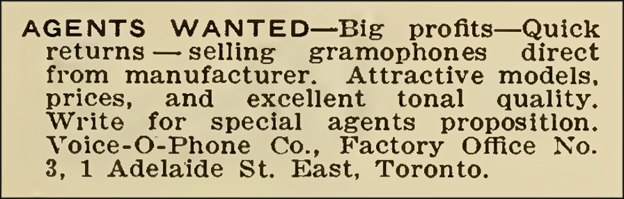 A second advertisement in the Toronto Daily Star dated October 30, 1920, p. 22 seeks agents to sell the Voice-O-Phone gramophone. The company has moved to 1 Adelaide Street East in Toronto.