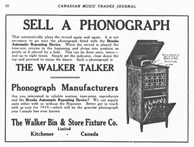 The Walker Talker phonograph was manufactured by The Walker Bin & Store Fixture Co., Limited, Kitchener, Ontario. The machine was fitted with the Brooks Automatic Repeating Device.