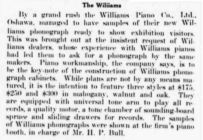 Canadian Music Trades Journal, June 1919, p. 78: "There is much talk of the Williams Piano Co.'s contemplating building phonographs. It is no secret that they have been experimenting for some time and the possibilities are that in the future they will manufacture phonographs. An announcement may be coming forth any day."