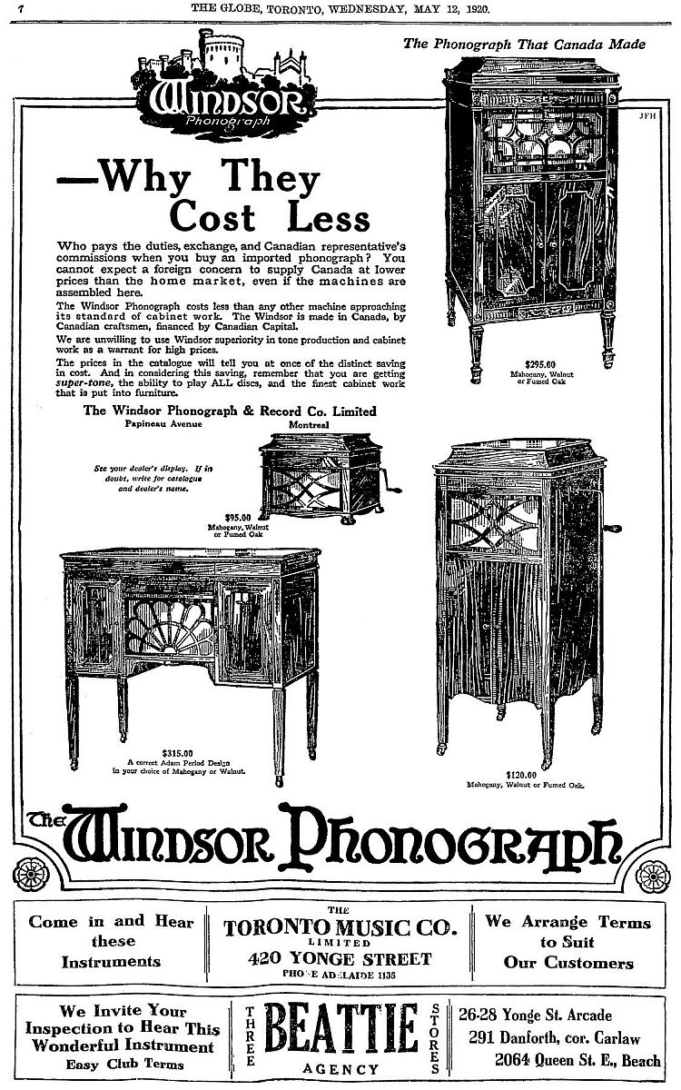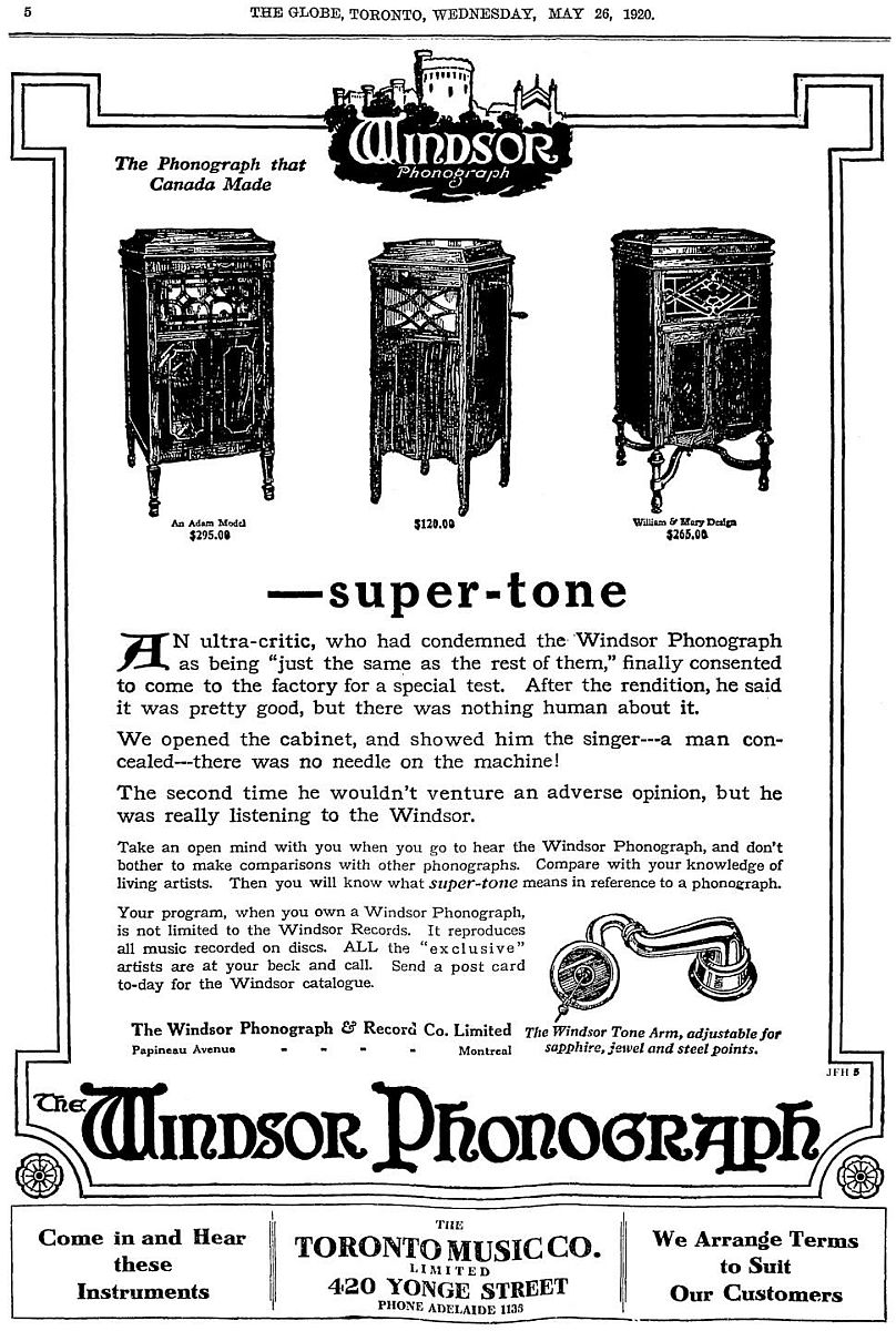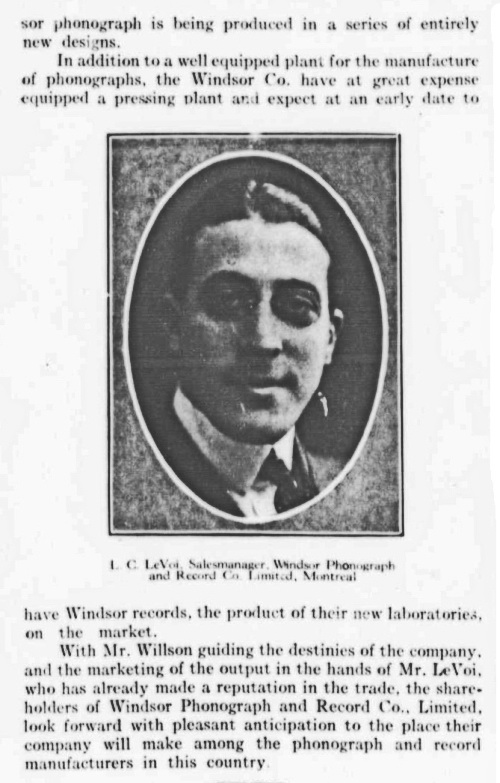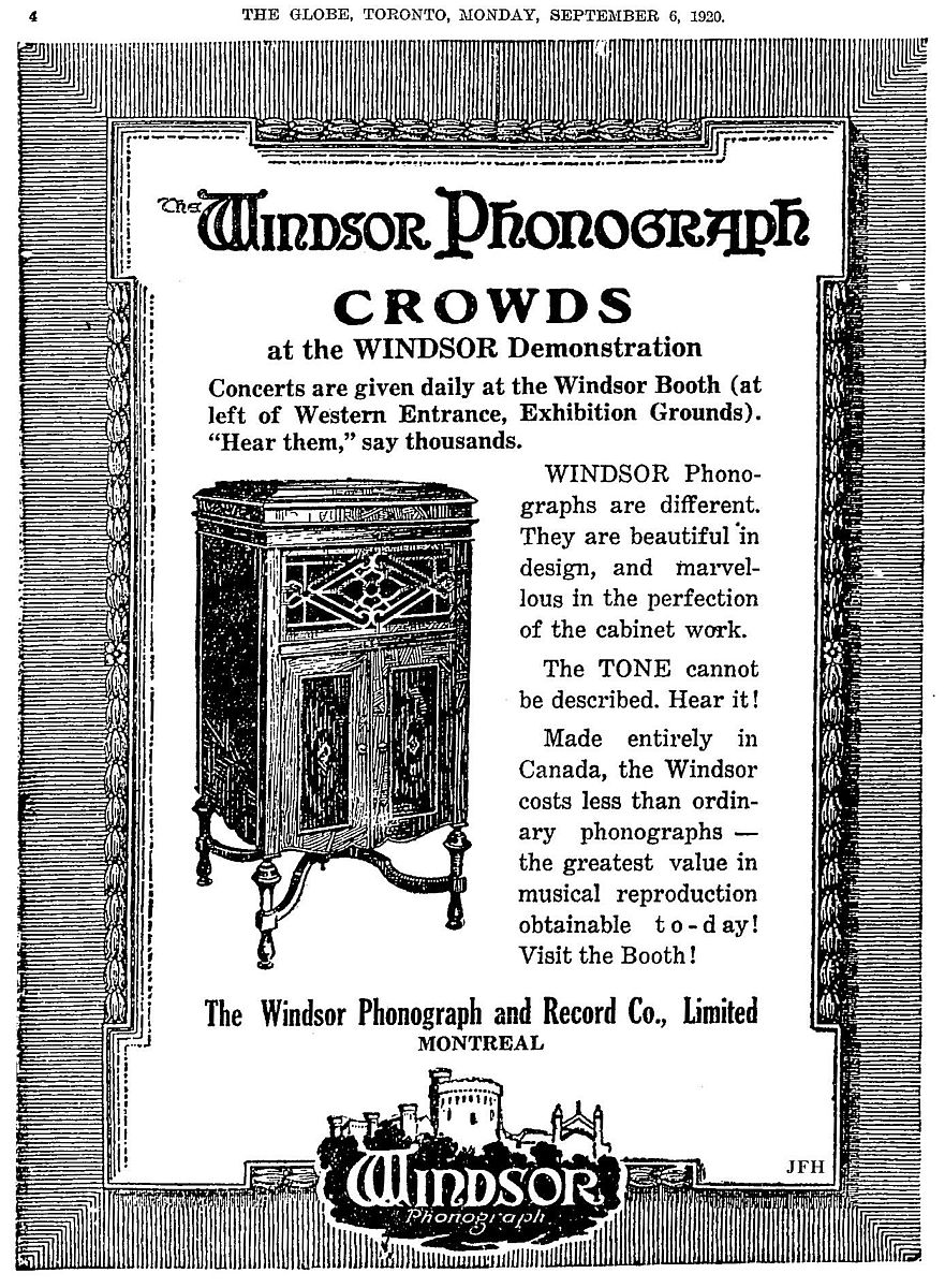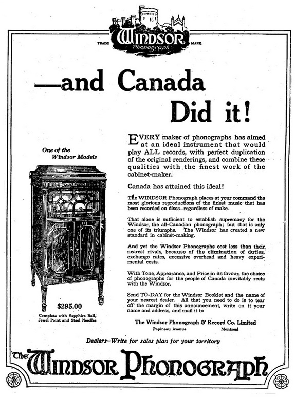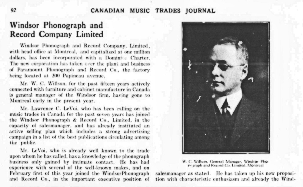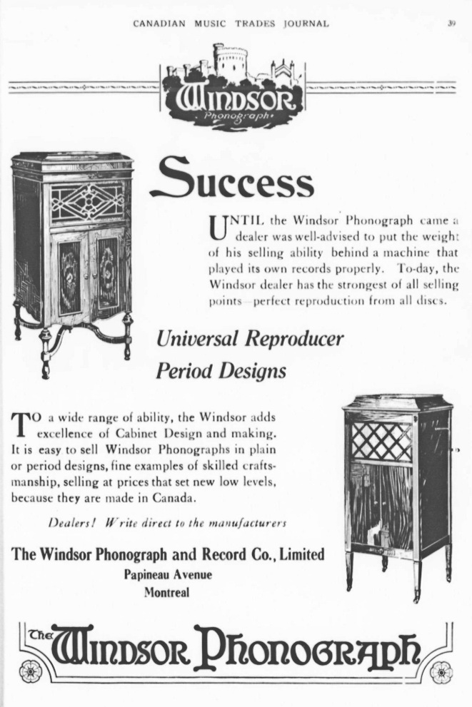 Canadian Furniture World and the Undertaker, March 1920, p. 46: "The Windsor Phonograph and Record Co., Ltd., Montreal, has been incorporated with a capital of $1,000,000."