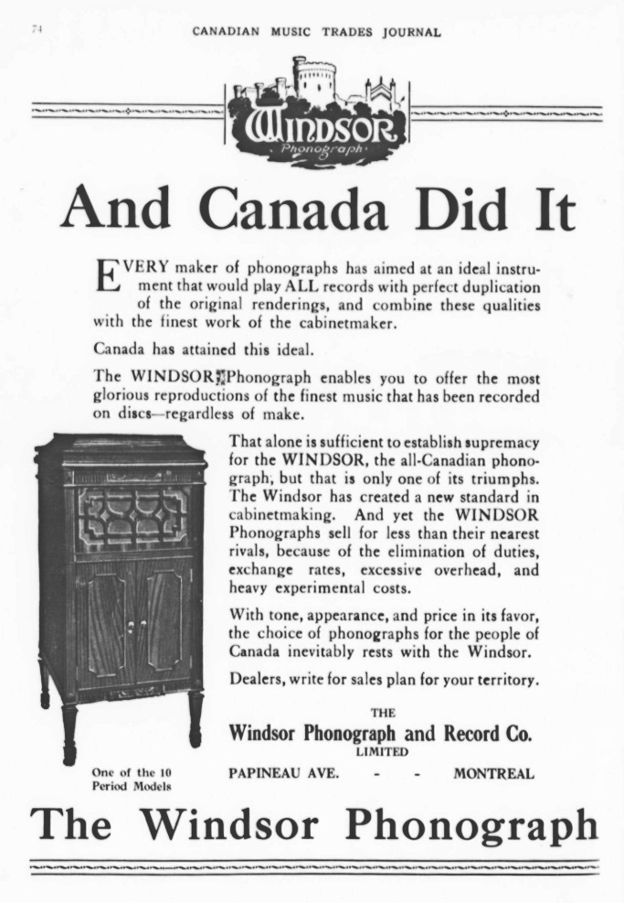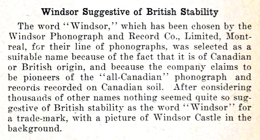 The Retail Druggist of Canada, May 1921, p. 17: "Windsor Suggestive of British Stability - The word "Windsor." which has been chosen by the Windsor Phonograph and Record Co.. Limited. Montreal, for their line of phonographs, was selected as a suitable name because of the fact that it is of Canadian or British origin, and because the company claims to be pioneers of the "all-Canadian" phonograph and records recorded on Canadian soil. After considering thousands of other names nothing seemed quite so suggestive of British stability as the word "Windsor" for a trade-mark, with a picture of Windsor Castle in the background."