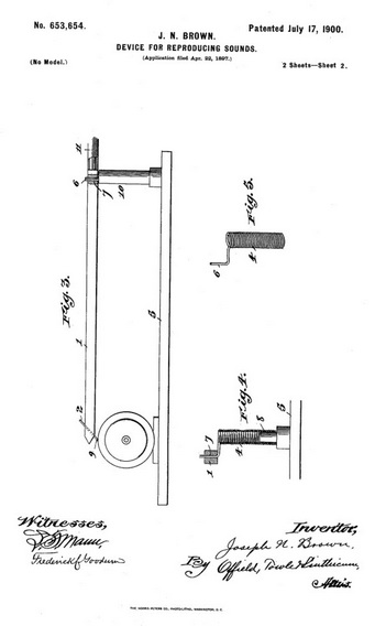 The Canadian talking machine is a finger-wind disc machine. The idea of such a simple device was in the air at the time. On April 22, 1897, Joseph N. Brown (1848-1913), who was born in Canada (Ontario), emigrated to the U.S. about 1863 and was living in Muskegon, Michigan, filed an application for a U.S. patent titled "Device for Reproducing Sounds". The patent was issued three years later on July 17, 1900, as U.S. patent no. 653,654. The distinguishing feature of Brown's device, illustrated in two patent drawings, was a solid wood tonearm, firmly-mounted steel needle and a sliding weight, identical to the tonearm assembly depicted in the drawing of the Canadian machine. No model was submitted with the patent application. The patent description noted that the invention was applicable for the reproduction of sounds recorded on both gramophone discs, illustrated on page 1 of the application, and phonograph cylinders, illustrated on page 2, and could use either listening tubes or a horn.
