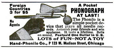 In December, 1924, Popular Mechanics ran an ad for the pocket phonograph from Hand-Phonilo Co., P 123 W. Madison Street, Chicago. The wondrous device is now called a "Phonilo".