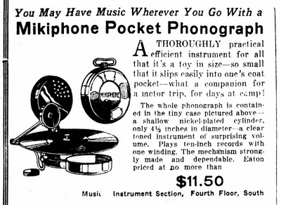 One year earlier, in 1923, a pocket phonograph was introduced by a Hungarian engineer whose slogan was "Carry your orchestra in your vest pocket." The Mikiphone usurped the name under the headline World's First Pocket Phonograph. A 1926 ad elaborated: "The Mikiphone is a genuine mechanical masterpiece. All records up to 10 inches in diameter may be played on it as on a large phonograph. ... The Mikiphone, by reason of its small size and round shape, can easily be carried in the pocket." (Edmonton Journal, April 9, 1926, p. 7)