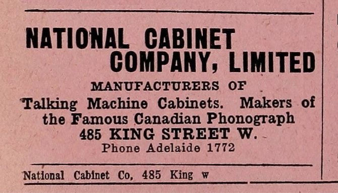 Canadian Woodworker and Furniture Manufacturer, December 1920, p. 142: "A. B. Beverley, recently purchased the premises at 485 King St. W., Toronto, where he operates the National Cabinet Co., producing five hundred phonograph cabinets a month. He intends making substantial additions to his factory. Several new machines will be installed and production increased to a thousand cabinets a month."