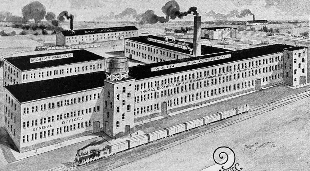 Thomas Brothers Ltd. Broom Factory, St. Thomas, Ontario, ca. 1905. Source: Elgin County Archives. From ca. 1920 to 1923, the complex was used by the Thomas Edison Co. as a phonograph factory.