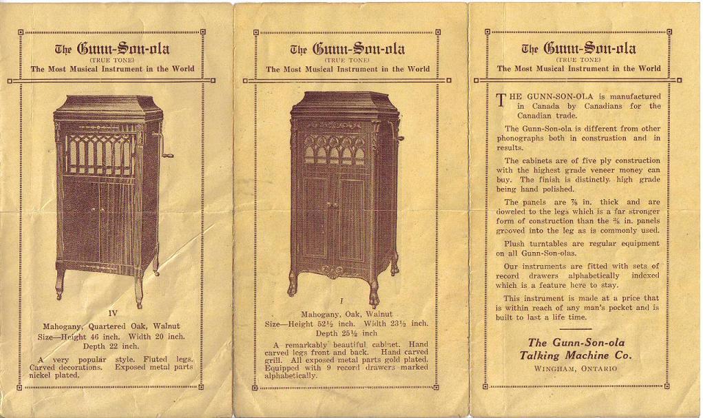 In September 1922, the Gunn-Son-Ola Talking Machine Company was established in Wingham, Ontario to manufacture organs, gramophones, pianos and other musical instruments. Gunn-son-ola churned out talking machines and cabinets for almost ten years, at its peak employing 162 people. In 1926, William Gunn died and the company was taken over by his Son, Carlyle Gunn. In July 1928, Gunn-Son-Ola received an order from Stromberg-Carlson for making radio cabinets. When the stock market crashed in 1929, orders dried up and Gunn-Son-Ola was forced to cut shifts. By 1931, the company was insolvent and the buildng was bought by 2 brothers, Moses and Abraham Brown, who started manufacturing oak toilet seats.