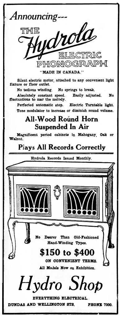 London Advertiser, June 17, 1921, p. 10. Introductory ad for the "Made in Canada" Hydrola Electric Phonograph in the London, Ontario Hydro Shop. Thanks to Norman Brooks for the ad.