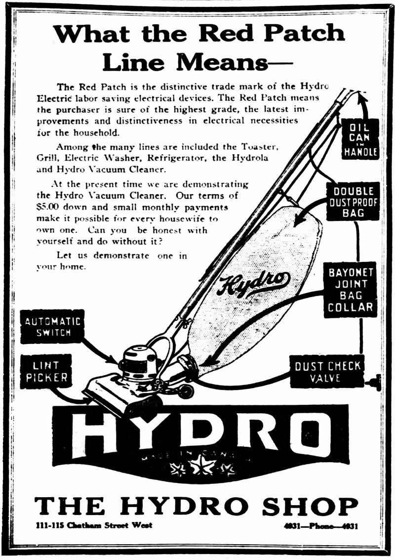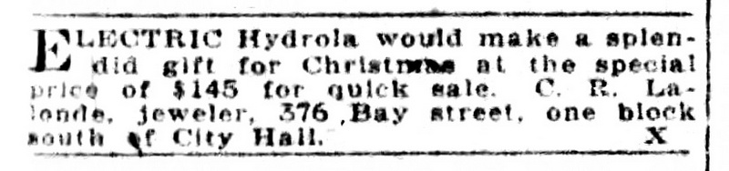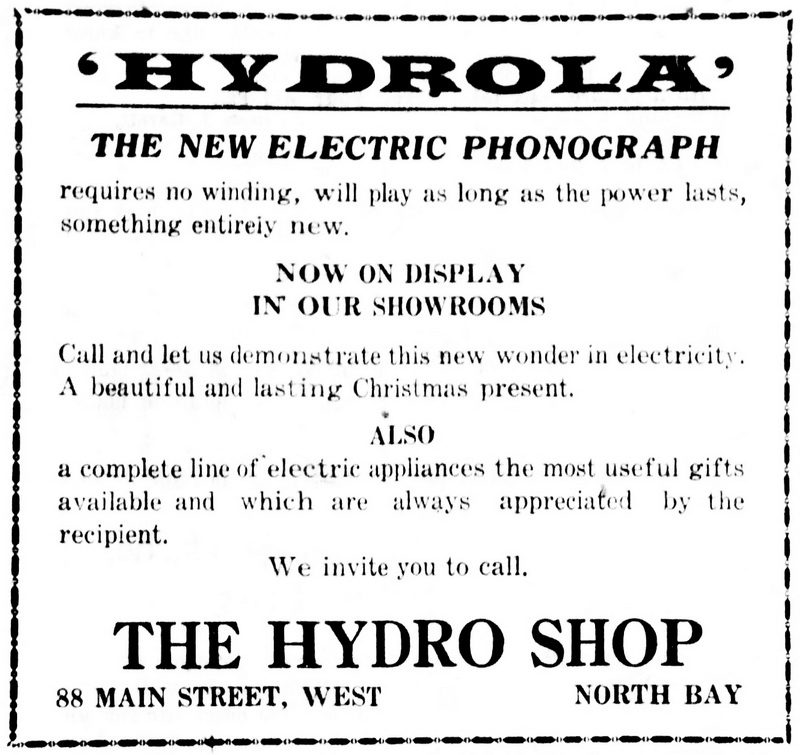 North Bay Nugget, December 3, 1921, p. 12. The Hydrola Electric Phonograph for sale in the Hydro Shop in North Bay, Ontario.