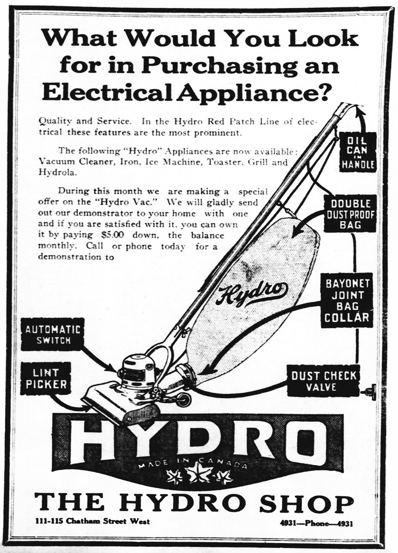 Driven by mayor and MPP, Sir Adam Beck, London became the second city in Ontario to obtain hydro electric power on November 30, 1910. Established in 1912, first in the city hall on Richmond Street and then in a former drug store on the corner of Dundas and Wellington Streets, the Hydro Shop was a pioneering retail store designed to promote electric appliances in the home and boost power consumption from Niagara Falls. Over the next several years, more Hydro Shops opened in other Ontario cities.