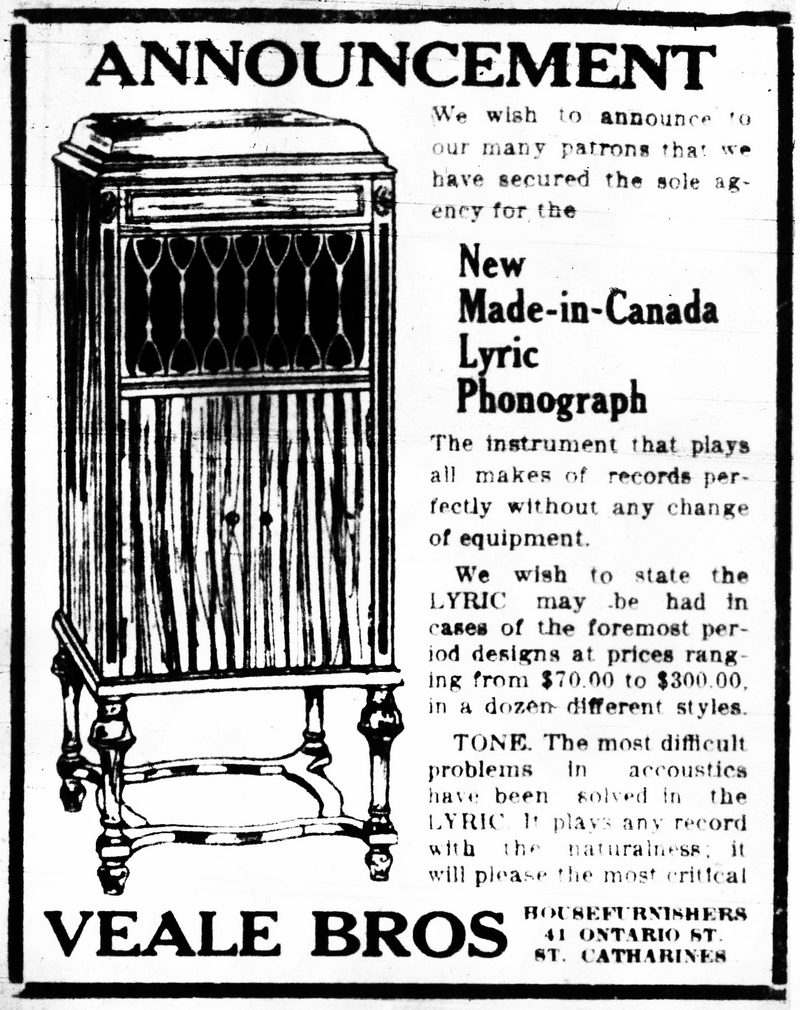 Canadian Woodworker and Furniture Manufacturer, October 1917, p. 104: "The George McLagan Furniture Company, Stratford, Ont., will manufacture a full line of Lyric phonographs. They are the sole Canadian makers of these machines, and, besides making the machines, will carry a complete catalogue of Lyric records. The manufacture of the machines is now well under way. The services of Mr. Russell L. Teeple, of Toronto, a phonograph expert, has been secured by the McLagan Company. Mr. Teeple will devote all his time to marketing and looking after the Lyric line." (see McLagan page.)