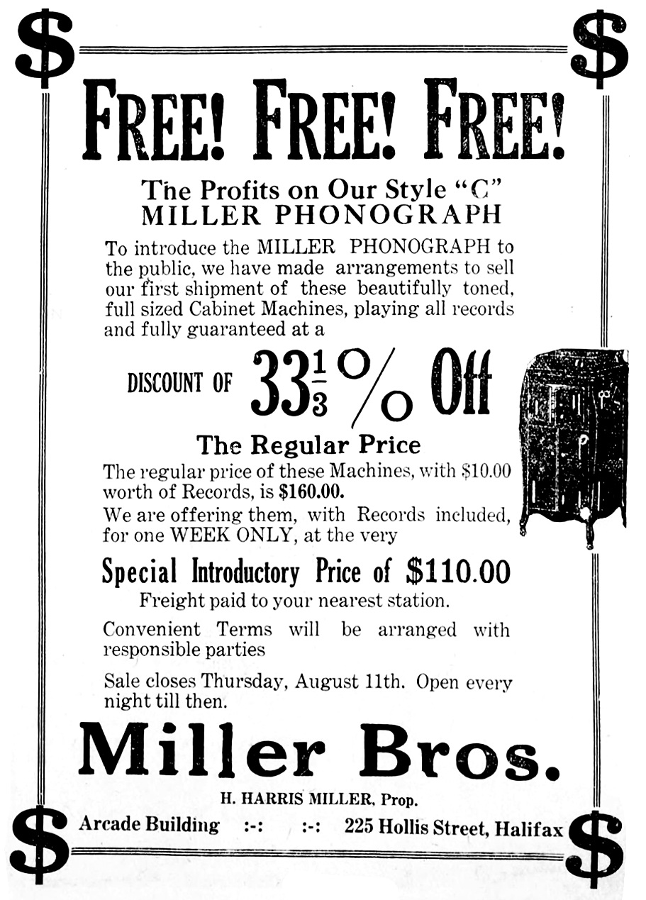 Halifax Evening Mail, August 6, 1921, p. 5. Ad for a Miller phonograph, Style "C" by Miller Bros., Arcade Building, 225 Hollis Street, Halifax, Nova Scotia.