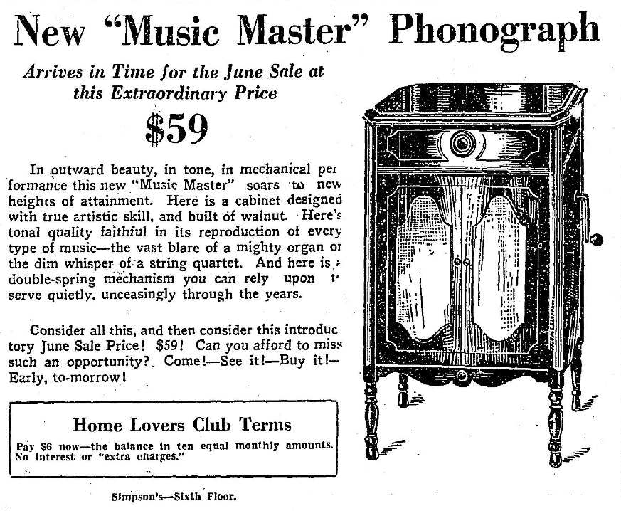 TDS June 24, 1929 p. 14, yet another new model with an introductory sale price of only $59.00. This was the last Simpson's display ad for the Music Master phonograph.