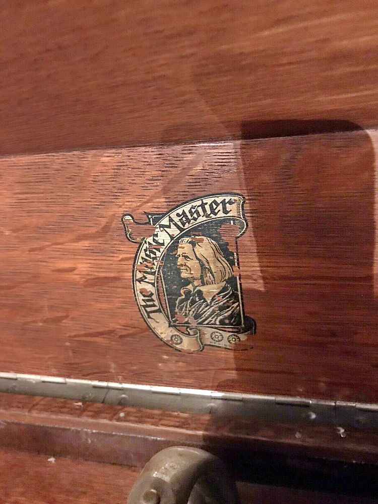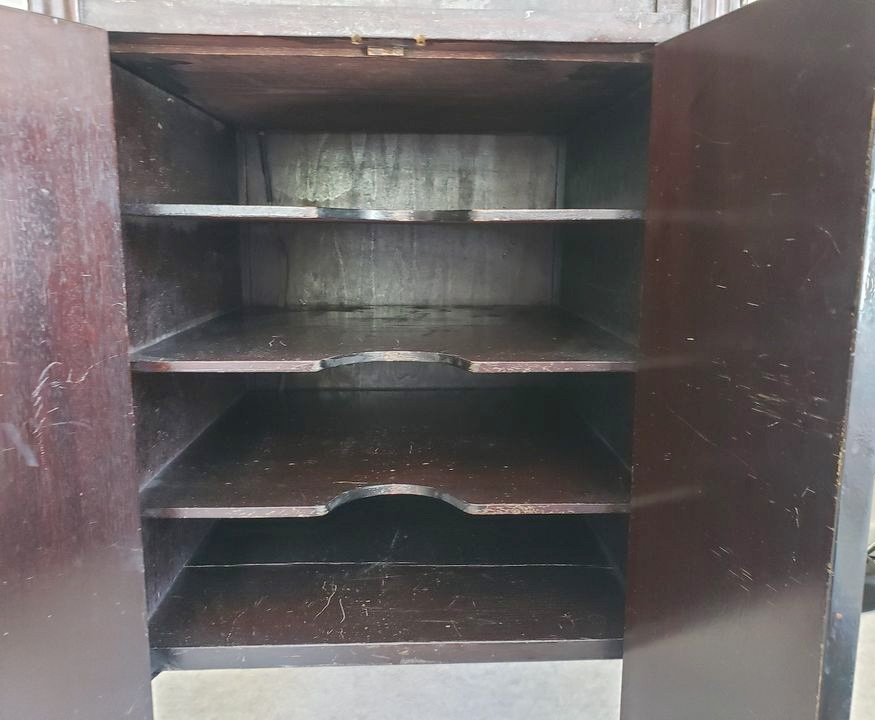 An upright cabinet Music Master in dark mahogany submitted by Norman Brooks in 2023. "The construction method and design of the cabinets looks very much to me like they may have been made by Phonola...and of course the hardware is very Phonolaesque." (See the Phonola page - https://www.capsnews.org/capp/phonola/phonola.html - especially the display ads for 1918 and 1919.)