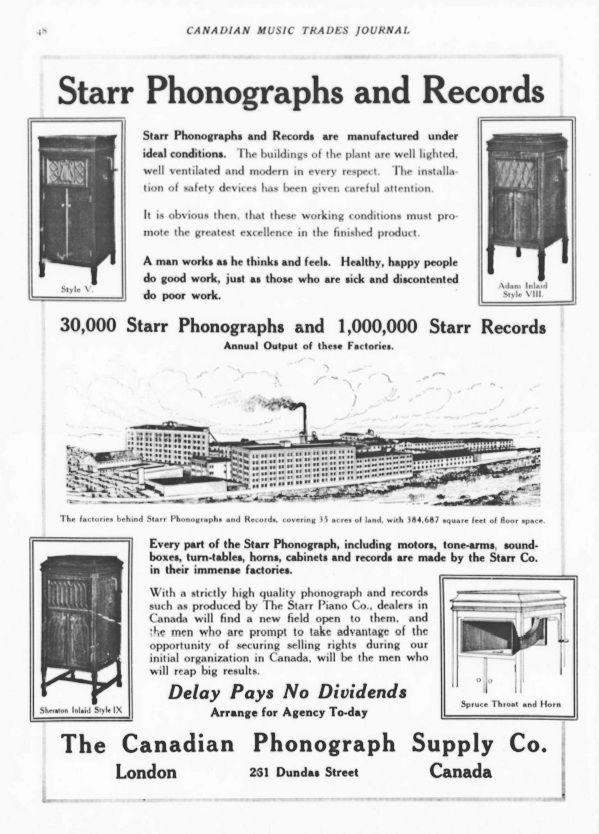Talking Machine World, November 15, 1920, p. 177: "The Starr Co. of Canada is planning the erection of a large factory at London, Ont."