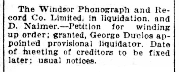 On June 14, 1921 there was an announcement in the Montreal Gazette: "The Windsor Phonograph and Record Co. Limited in liquidation. Petition for winding up order: granted. George Duclos appointed provisional liquidator."