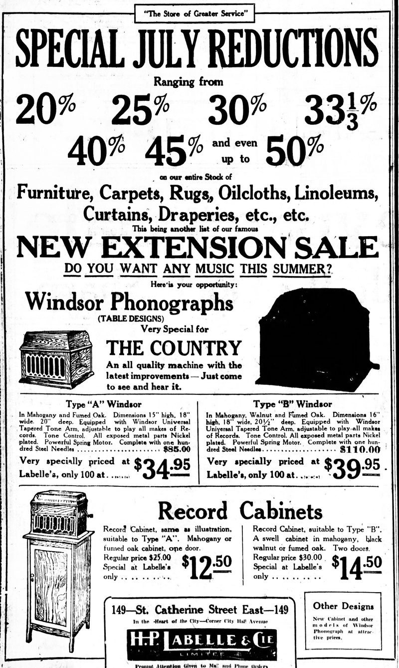 Montreal Star, July 7, 1921, p. 16. H. P. LaBelle & Cie, Limitée, 149 rue St. Catherine est, a Windsor dealer, began selling the remaining stock of Windsor phonographs and record cabinets.