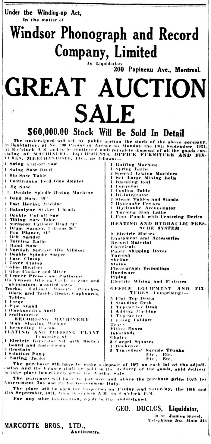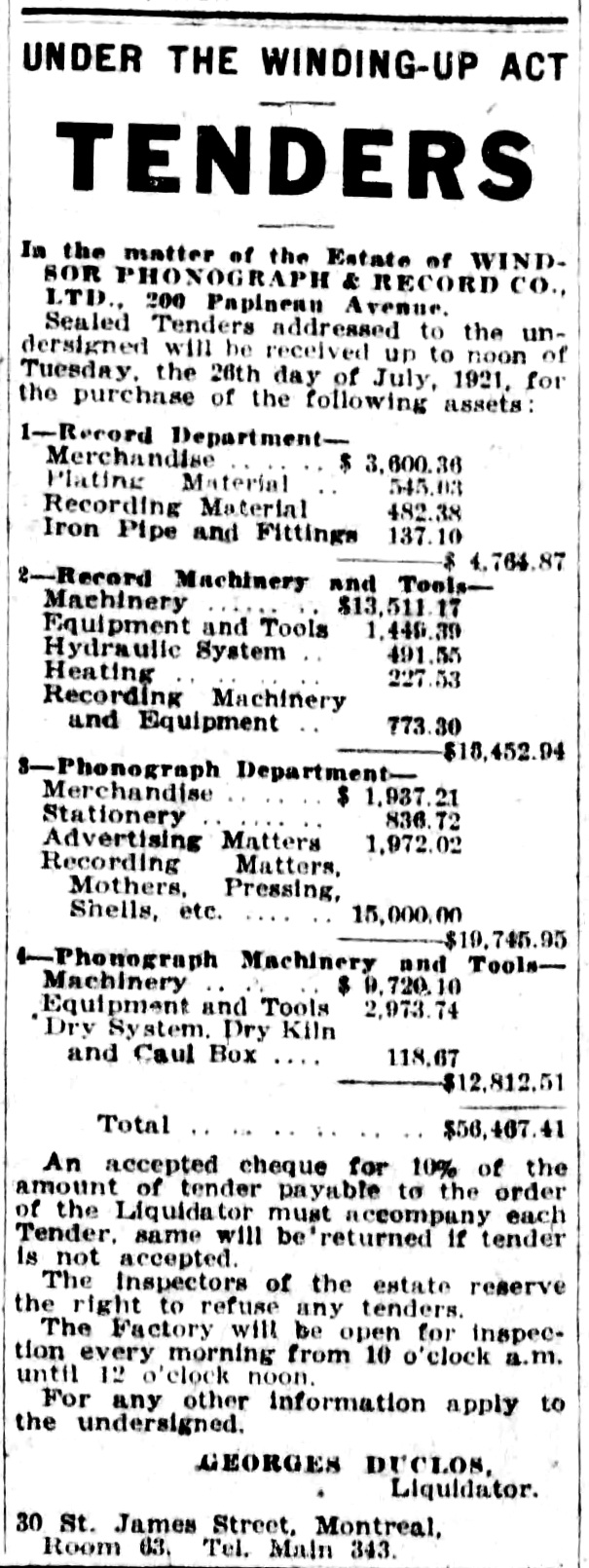 Montreal Star, July 16, 1921, p. 29. In the matter of the Estate of Windsor Phonograph & Record Co., Ltd., 200 Papineau Avenue, Montreal, the liquidator, George Duclos, advertised for tenders by noon, Tuesday, July 26, 1921, to bid on the entire assets of the company.