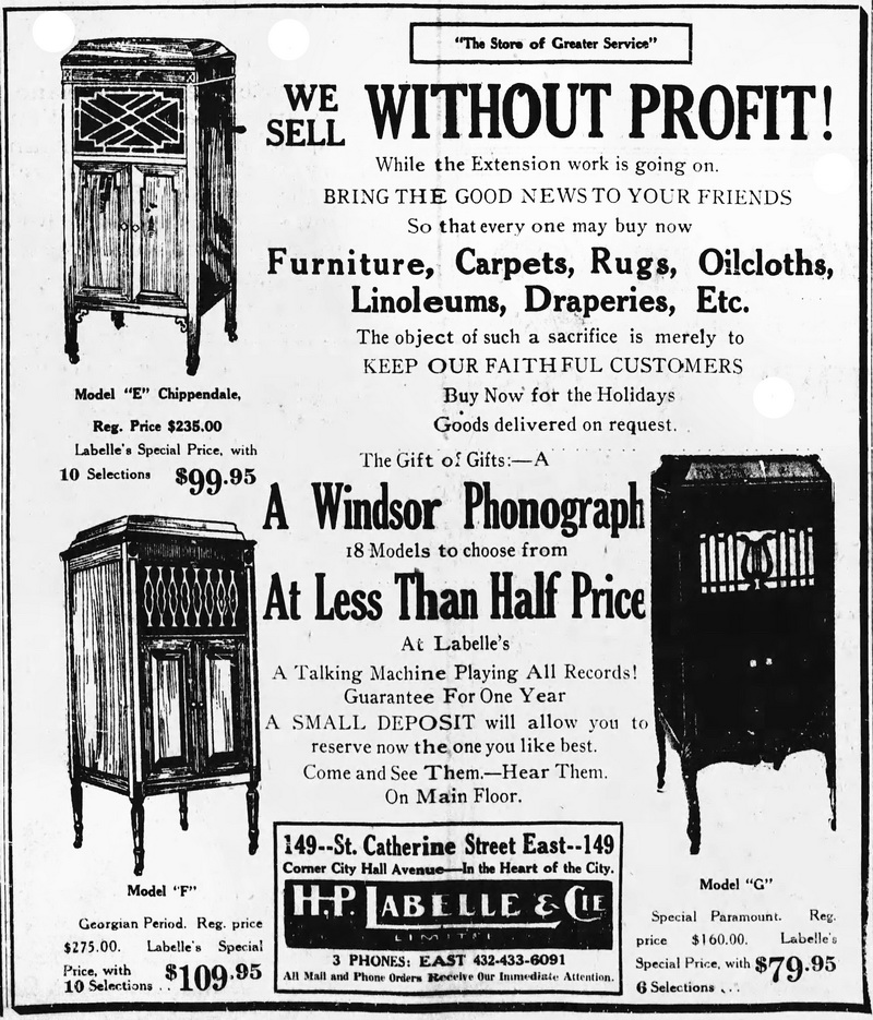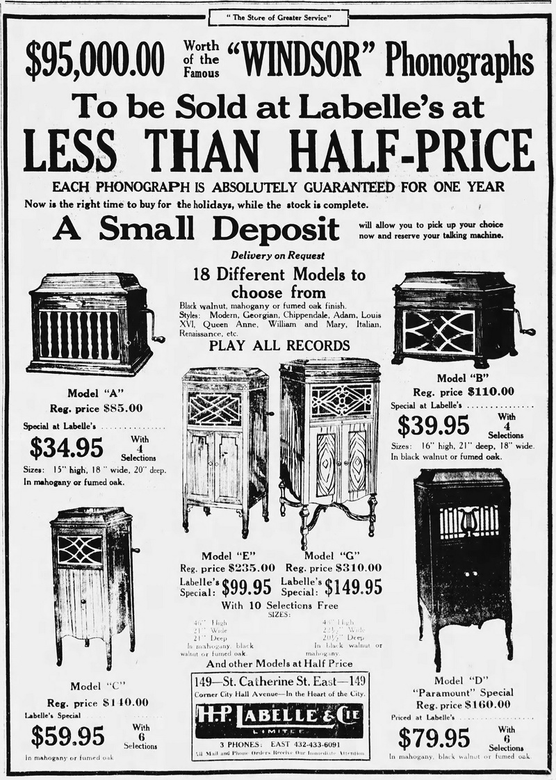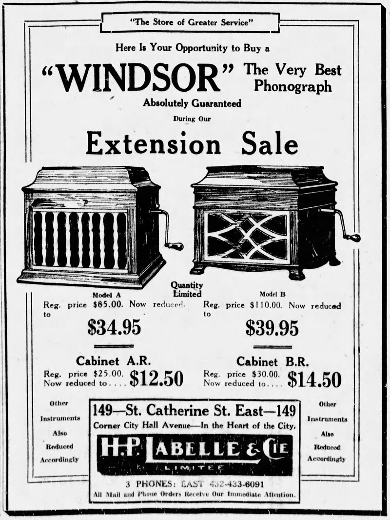 Montreal Star, November 4, 1921, p. 15. Sale of Windsor phonographs at LaBelle's for less than half price.