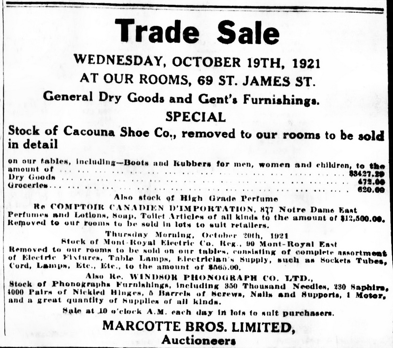 Montreal Star, September 8, 1921, p. 21. The company was put up for auction. Marcotte Bros. Limited, Auctioneers.