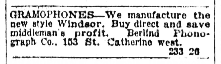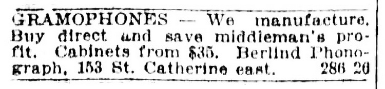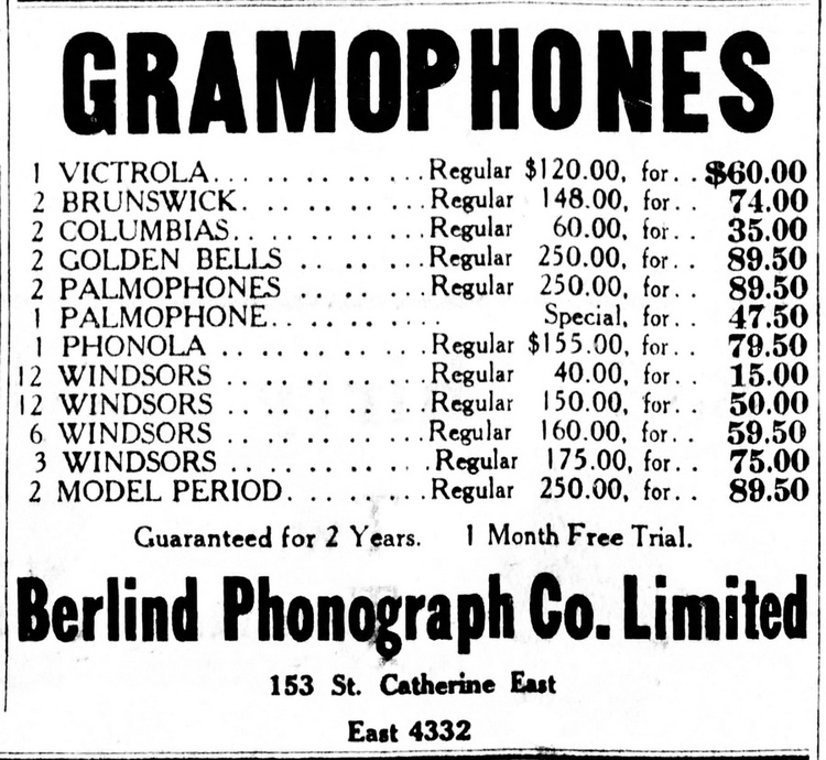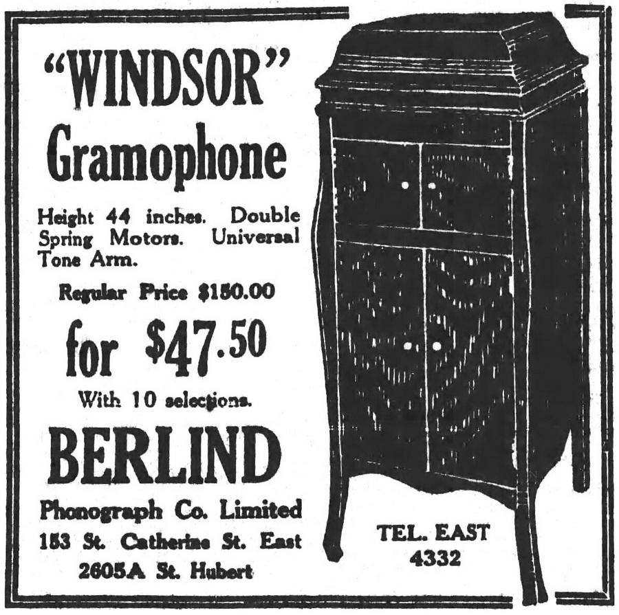 The Berlind Phonograph Co. Ltd., 153 St. Catherine East, Montreal, Quebec was a dealer in Brunswick, Victor, Golden Bell, Palm-o-phone and Windsor phonographs. Peter S. Berlind was the manager of their Brunswick Shop. Their first advertisements appeared in the Montreal Star in late 1917. Berlind was also a major dealer in phonograph needles, accessories, supplies and repair parts, specializing in Windsor main springs. On October 27, 1922, they announced that they manufactured the new style Windsor phonograph. Was this the label of the new Windsor phonograph? The only example found has a cabinet similar to a Victor-Victrola XVI and bears a dealer label "Hughes Music Sales Co. Toronto".
